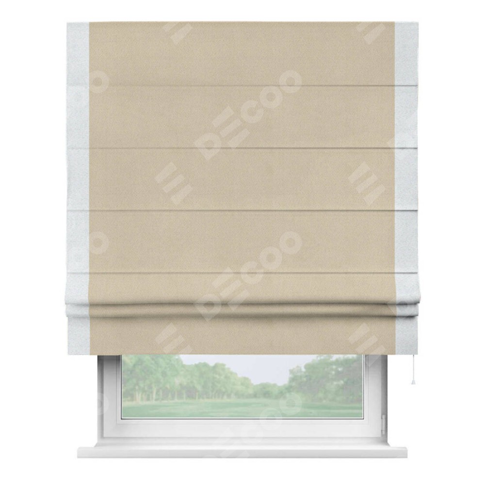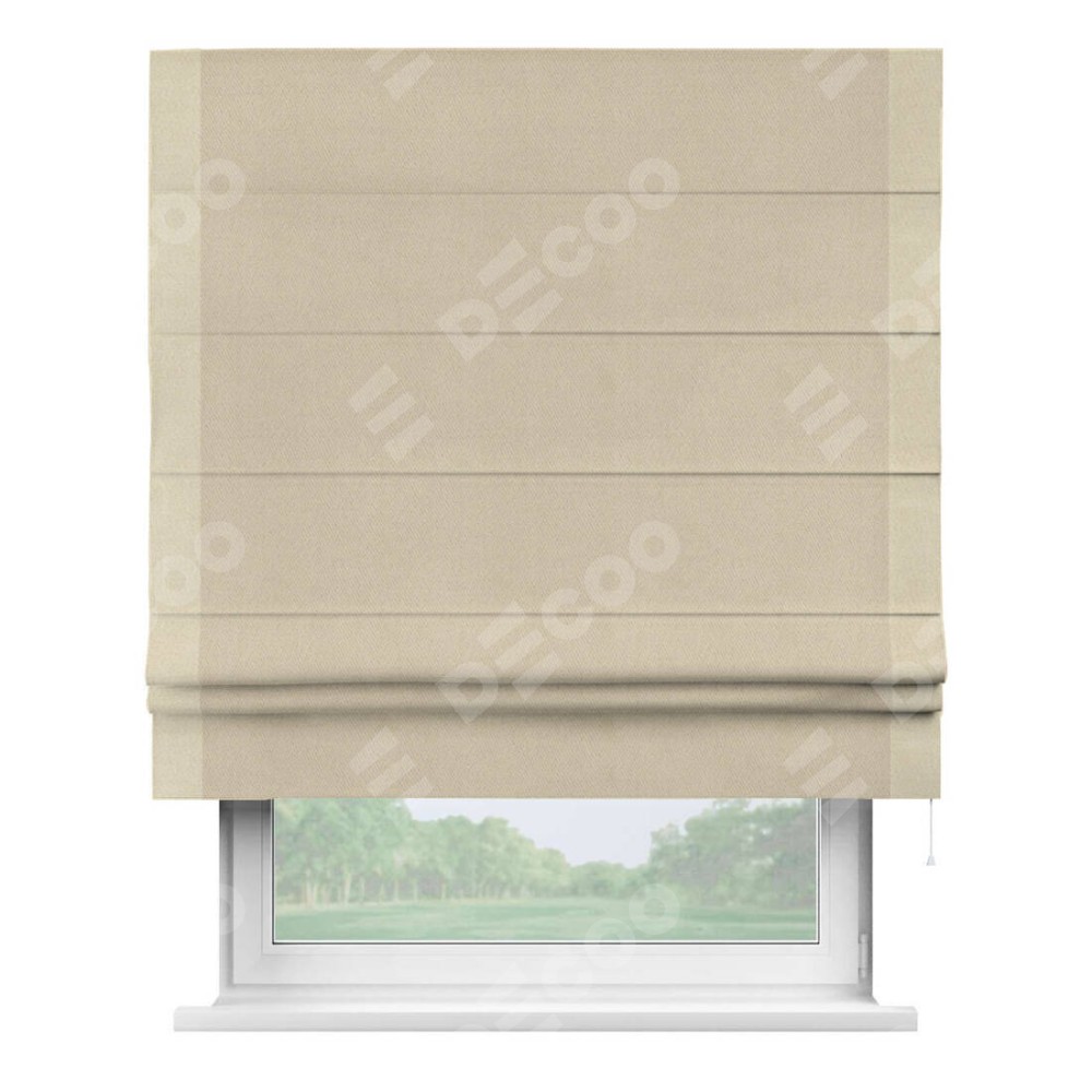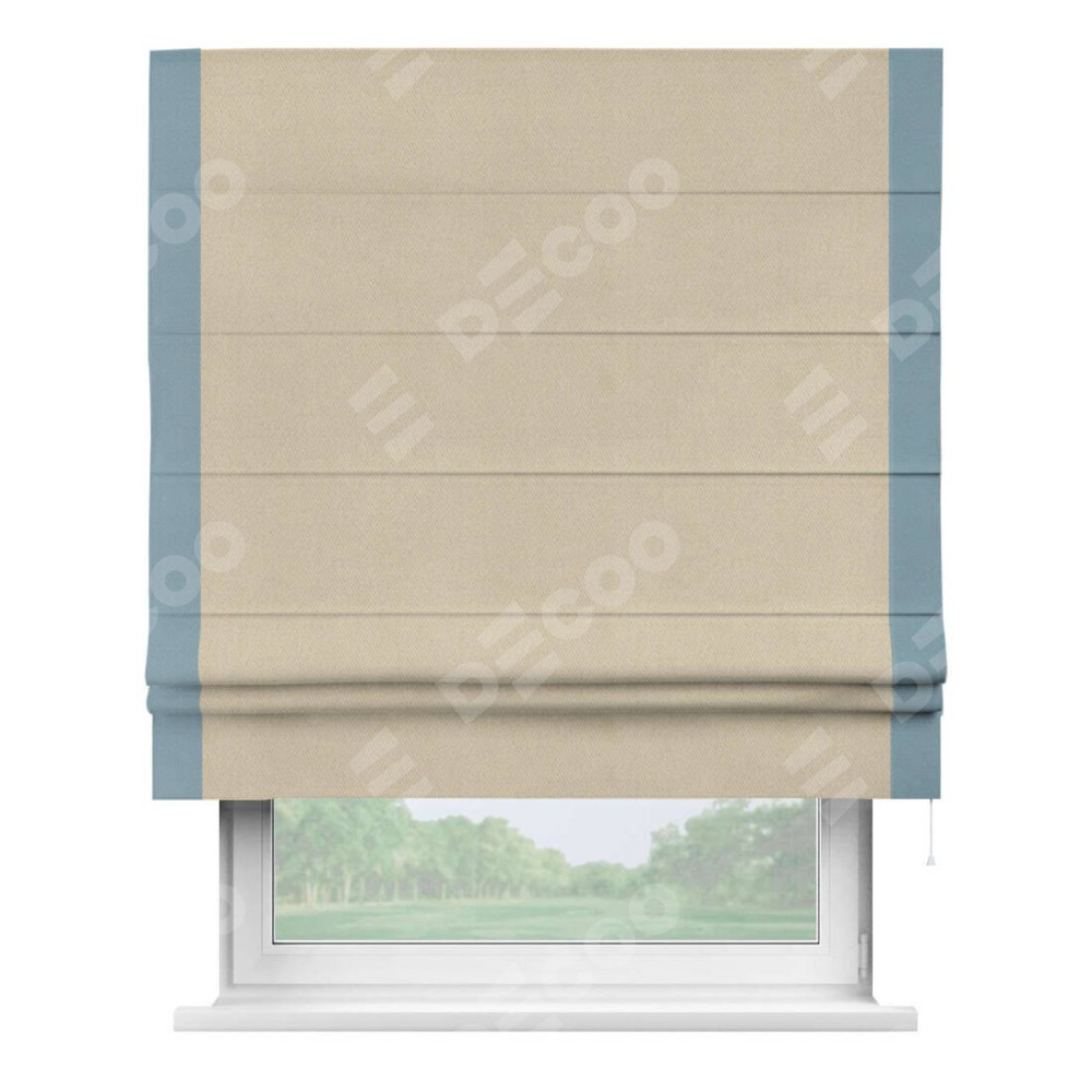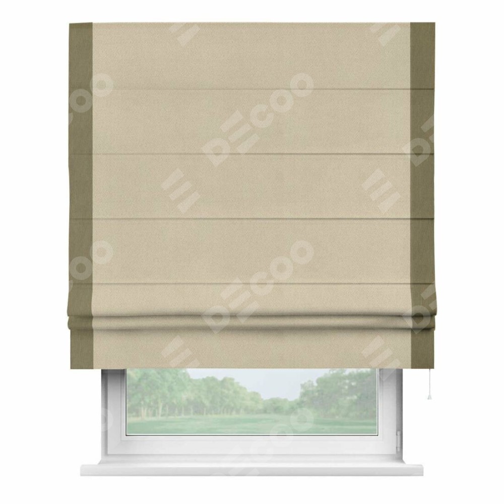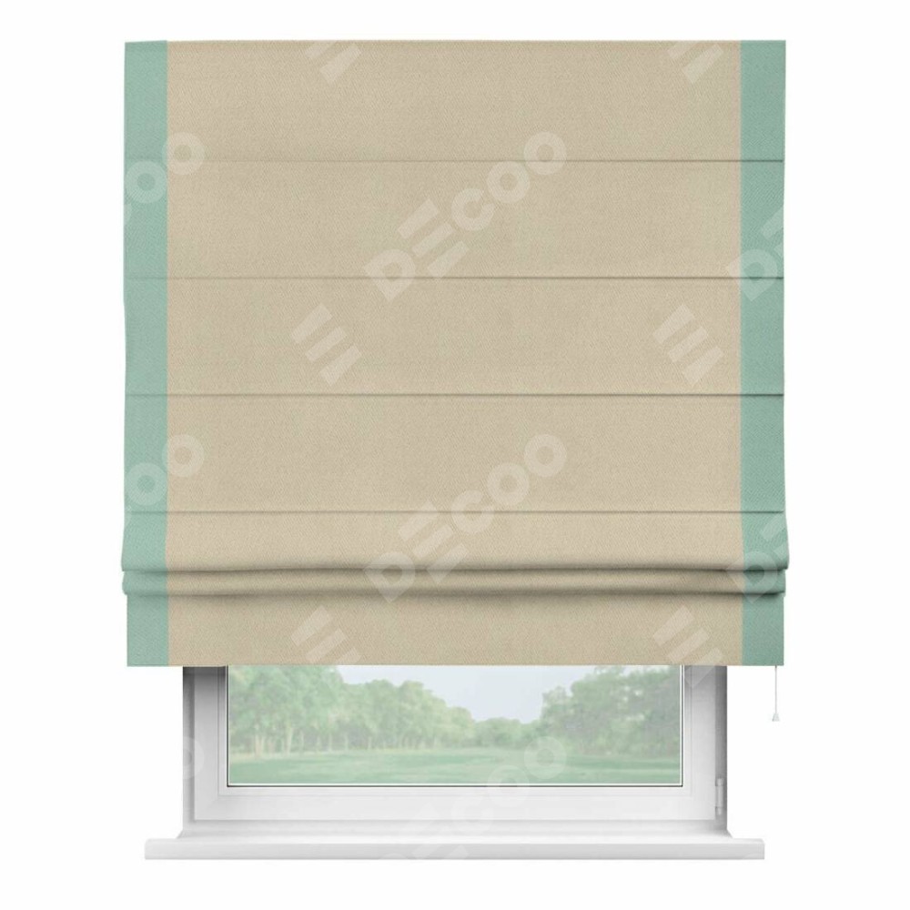 Римская штора производителя «Cortin», используется для проёма, пошита из ткани блэкаут однотонный кофейно-бежевый, артикул ткани 12095−1. Отделка шторы кантом «Стрим Дуо», ткань для канта используется из блэкаута однотонного разной расцветки на выбор. Имеет универсальный механизм и подходит для монтажа: на потолок, на стену и в нишу.