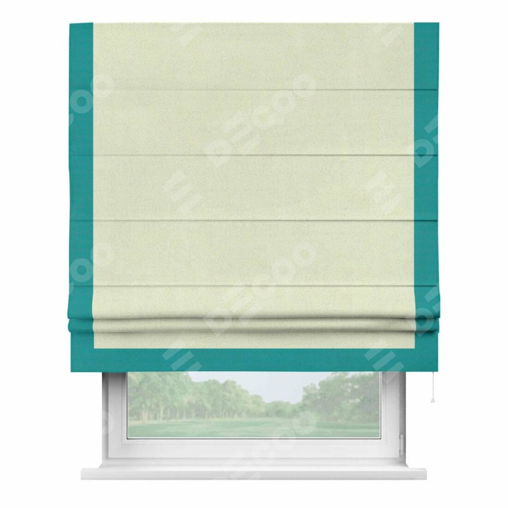 Римская штора производителя «Cortin», используется для проёма, пошита из ткани блэкаут однотонный сливочный, артикул ткани 6668−02. Отделка шторы кантом «Виктория», ткань для канта используется из блэкаута однотонного разной расцветки на выбор. Имеет универсальный механизм и подходит для монтажа: на потолок, на стену и в нишу.