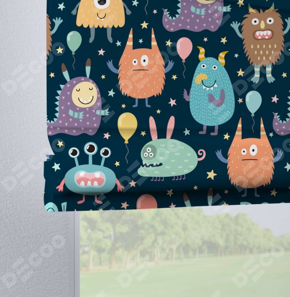 Римская штора производителя «Cortin», используется для проёма, пошита из ткани блэкаут с нанесением сублимационной печати «Звёздные страшилки». Данная модель пошита на петлях, комплектуется на выбор круглым карнизом и подходит для монтажа на стену. Римская штора на петлях имеет простую систему регулировки высоты, отличительным преимуществом данной модели является простой способ монтажа. Достаточно повесить ее на трубу и штора готова!