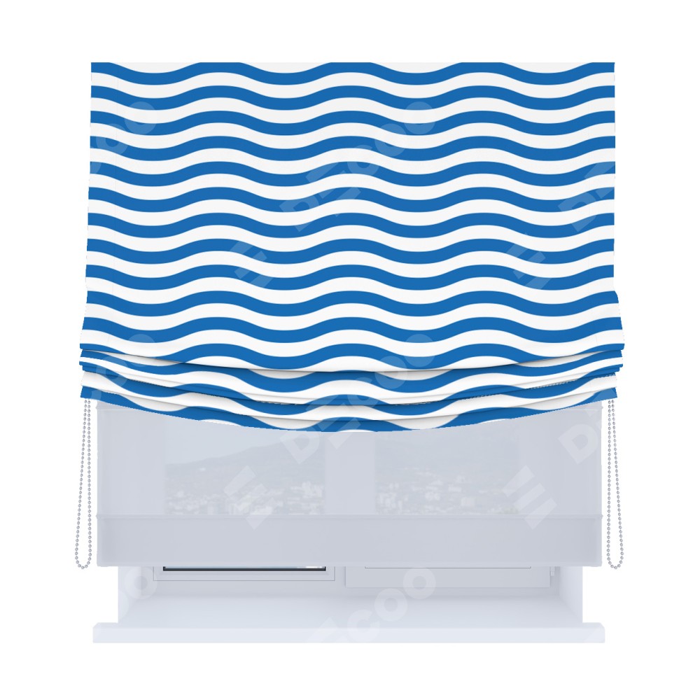 Римская штора день-ночь производителя «Cortin», используется для проёма, пошита из двух полотен, с лицевой блэкаут с нанесением сублимационной печати «Волнистые линии», вторая ткань тюль (по стандарту комплектуется тюль белого цвета артикул V-01). Имеет универсальный механизм и подходит для монтажа: на потолок, на стену и в нишу. Удобное управление каждой шторой отдельно.