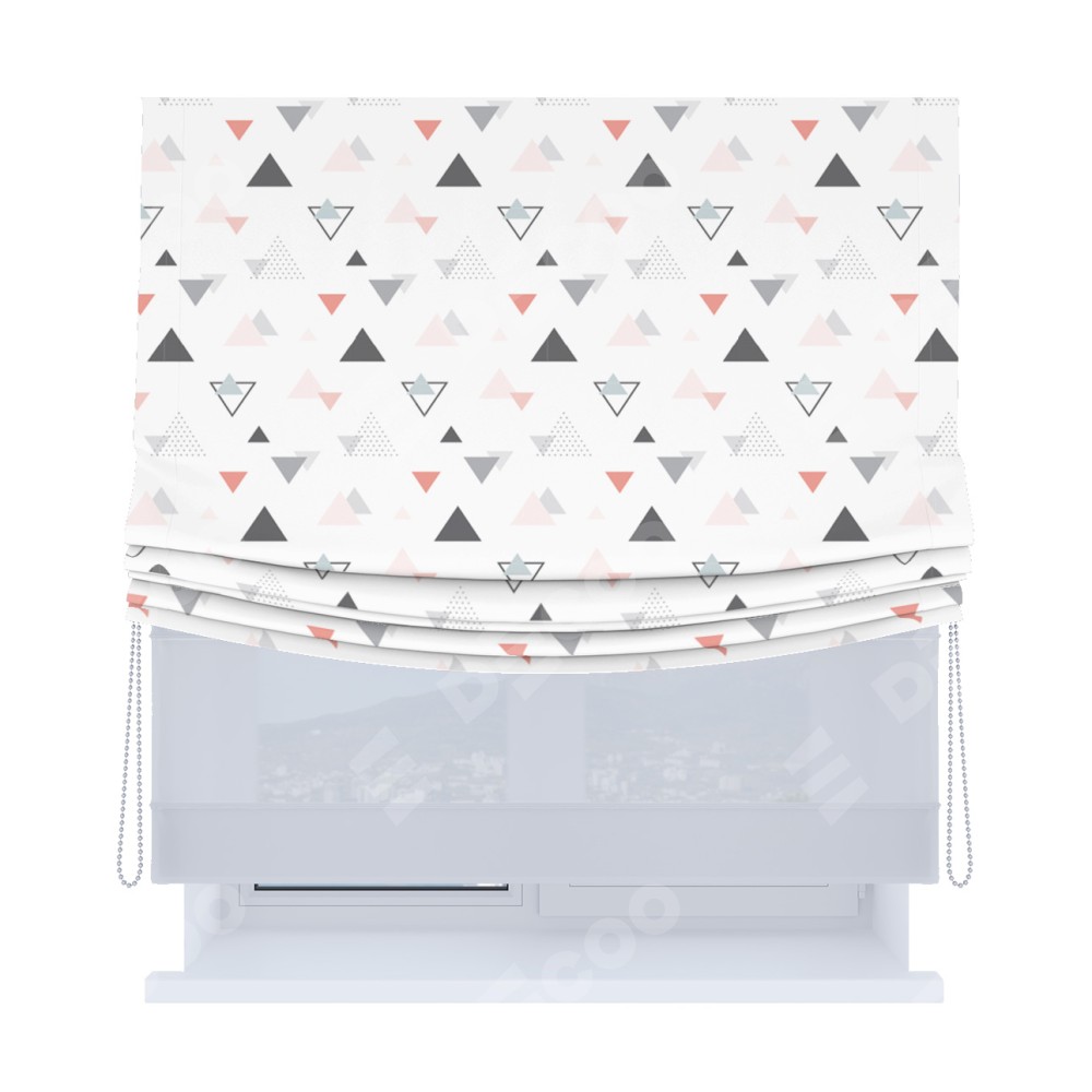 Римская штора день-ночь производителя «Cortin», используется для проёма, пошита из двух полотен, с лицевой блэкаут с нанесением сублимационной печати «Дождь из треугольников», вторая ткань тюль (по стандарту комплектуется тюль белого цвета артикул V-01). Имеет универсальный механизм и подходит для монтажа: на потолок, на стену и в нишу. Удобное управление каждой шторой отдельно.