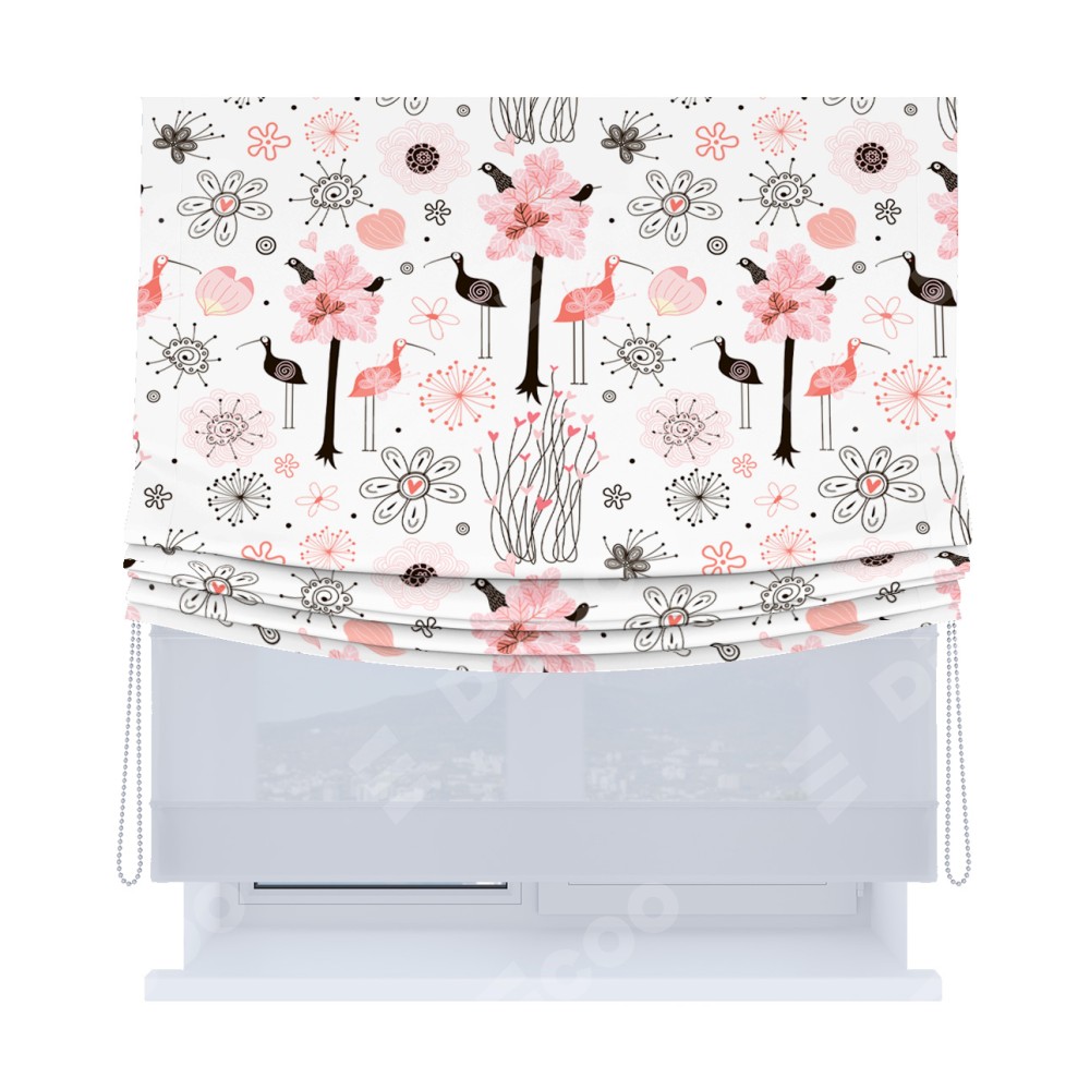 Римская штора «Кортин», день-ночь с мягкими складками, «Любопытные птички»