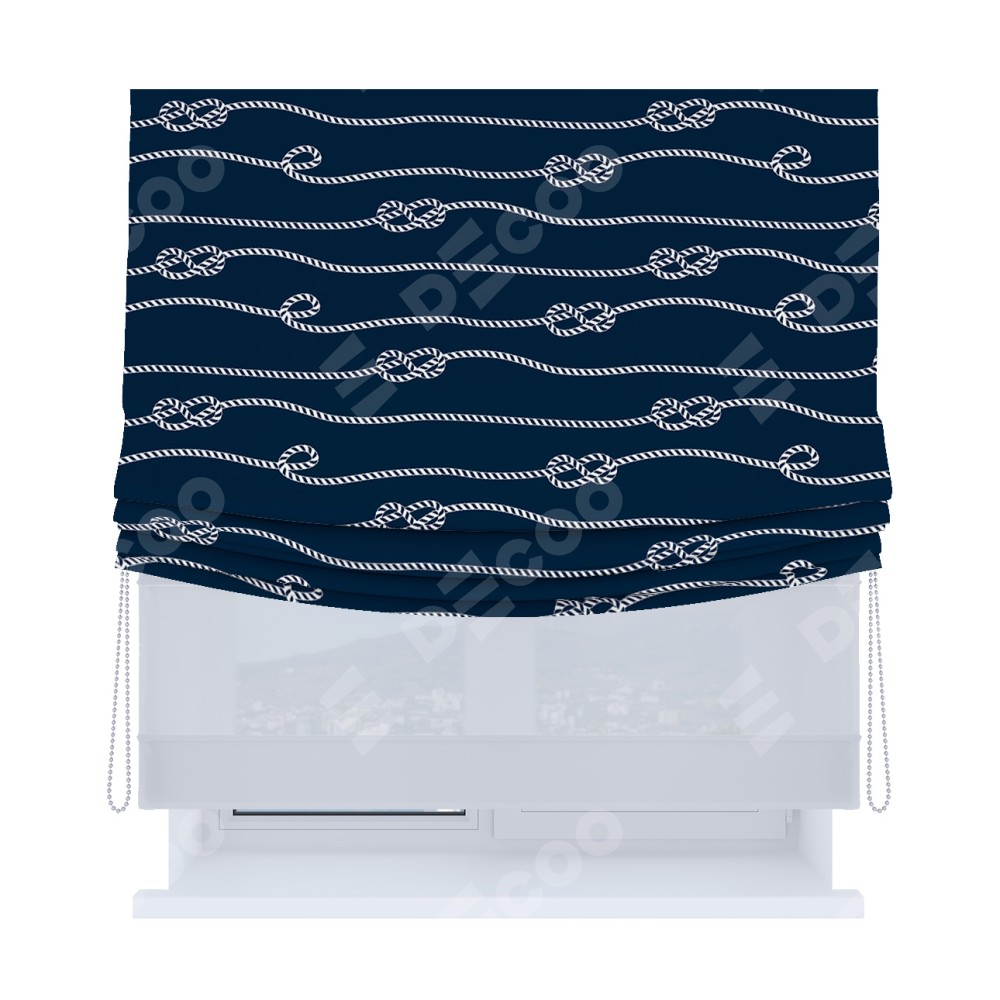 Римская штора день-ночь производителя «Cortin», используется для проёма, пошита из двух полотен, с лицевой блэкаут с нанесением сублимационной печати «Морской узел», вторая ткань тюль (по стандарту комплектуется тюль белого цвета артикул V-01). Имеет универсальный механизм и подходит для монтажа: на потолок, на стену и в нишу. Удобное управление каждой шторой отдельно.