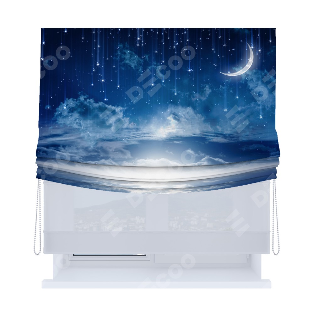 Римская штора день-ночь производителя «Cortin», используется для проёма, пошита из двух полотен, с лицевой блэкаут с нанесением сублимационной печати «Ночное небо», вторая ткань тюль (по стандарту комплектуется тюль белого цвета артикул V-01). Имеет универсальный механизм и подходит для монтажа: на потолок, на стену и в нишу. Удобное управление каждой шторой отдельно.
