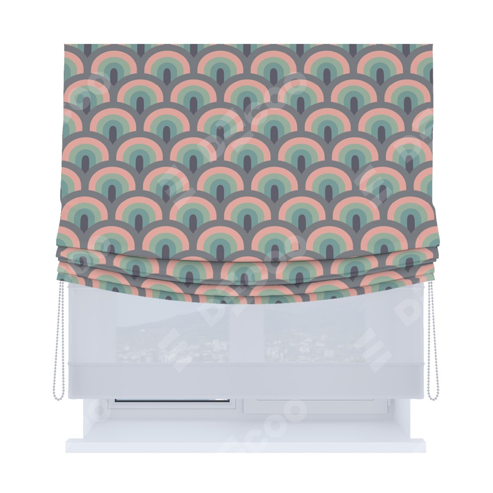 Римская штора день-ночь производителя «Cortin», используется для проёма, пошита из двух полотен, с лицевой блэкаут с нанесением сублимационной печати «Ретро орнамент», вторая ткань тюль (по стандарту комплектуется тюль белого цвета артикул V-01). Имеет универсальный механизм и подходит для монтажа: на потолок, на стену и в нишу. Удобное управление каждой шторой отдельно.