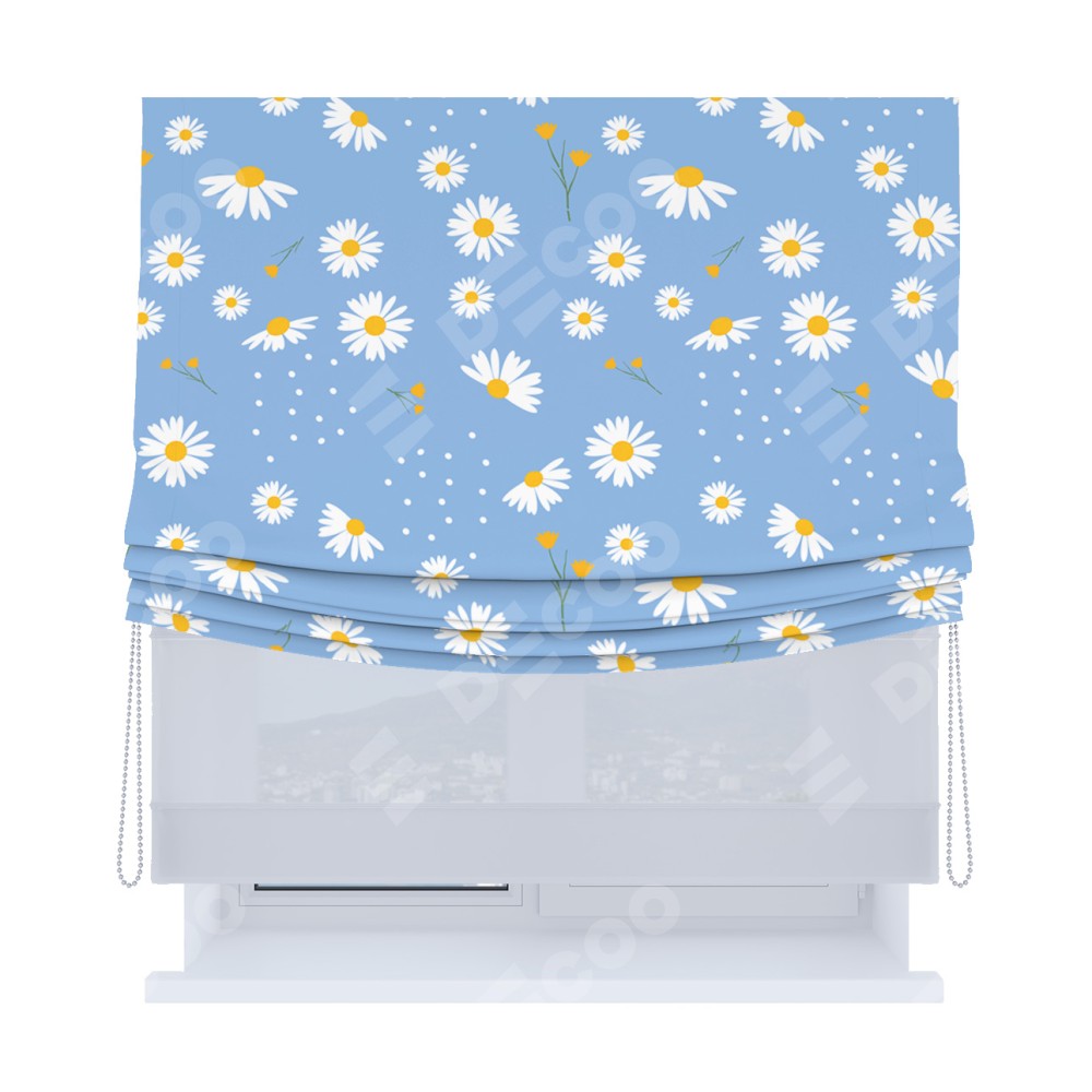 Римская штора «Кортин», день-ночь с мягкими складками, «Ромашки на голубом»