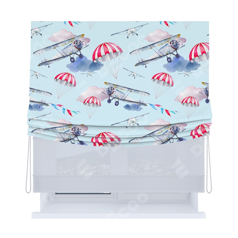 Римская штора день-ночь производителя «Cortin», используется для проёма, пошита из двух полотен, с лицевой блэкаут с нанесением сублимационной печати «Самолёт», вторая ткань тюль (по стандарту комплектуется тюль белого цвета артикул V-01). Имеет универсальный механизм и подходит для монтажа: на потолок, на стену и в нишу. Удобное управление каждой шторой отдельно.