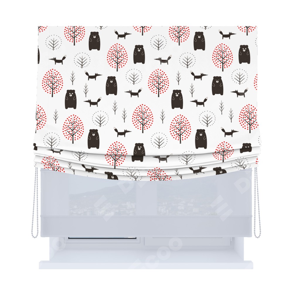 Римская штора день-ночь производителя «Cortin», используется для проёма, пошита из двух полотен, с лицевой блэкаут с нанесением сублимационной печати «Сканди лес», вторая ткань тюль (по стандарту комплектуется тюль белого цвета артикул V-01). Имеет универсальный механизм и подходит для монтажа: на потолок, на стену и в нишу. Удобное управление каждой шторой отдельно.