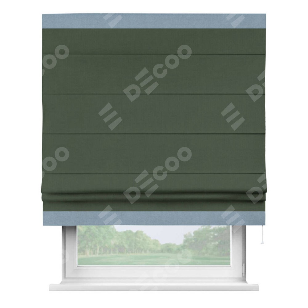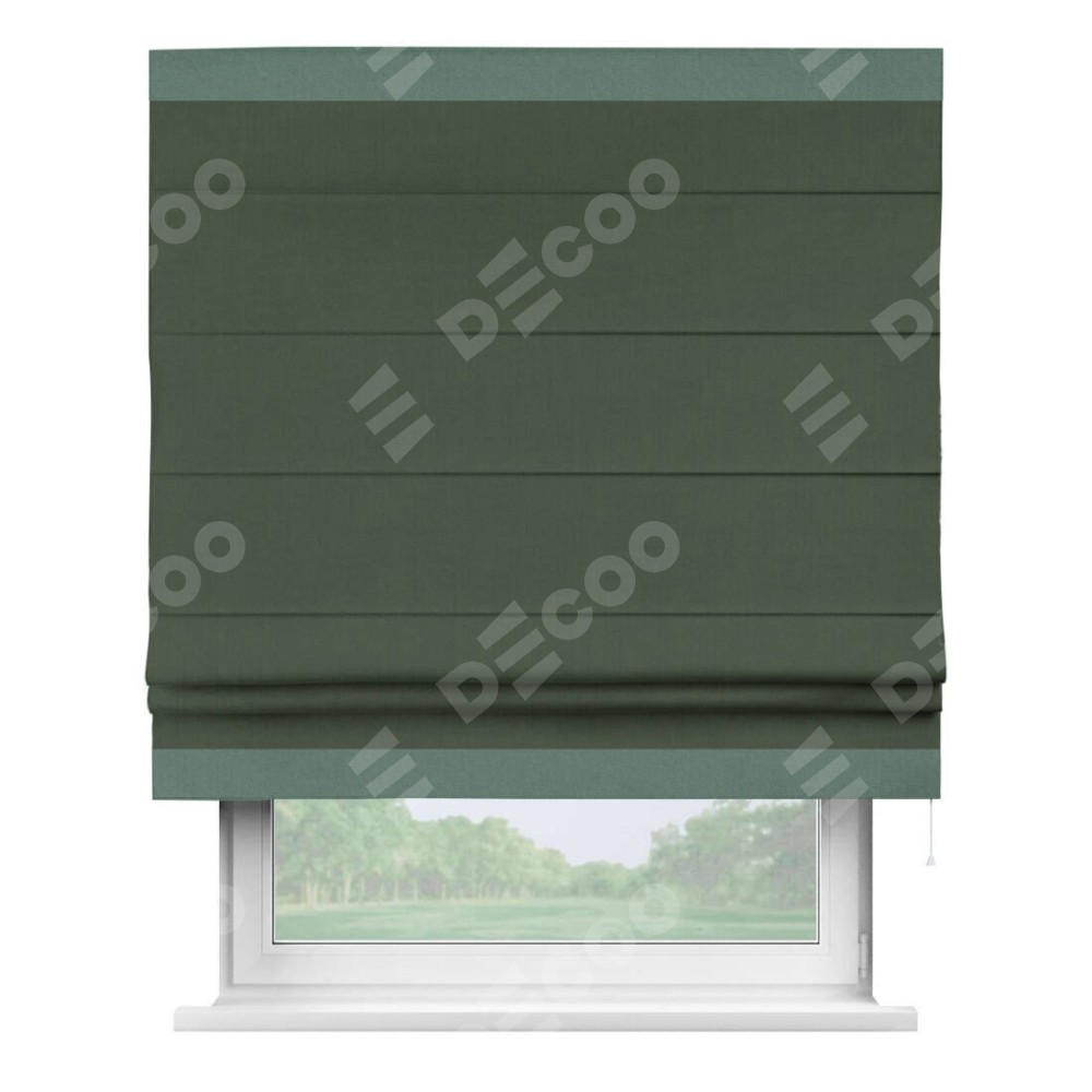 Римская штора производителя «Cortin», используется для проёма, пошита из ткани лён блэкаут зелёный, артикул 69497. Отделка шторы кантом «Горизонт», ткань для канта используется из льна разной расцветки на выбор. Имеет универсальный механизм и подходит для монтажа: на потолок, на стену и в нишу.