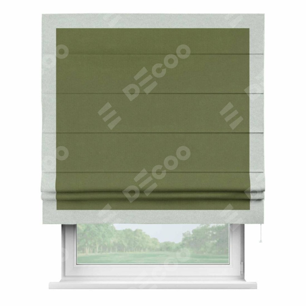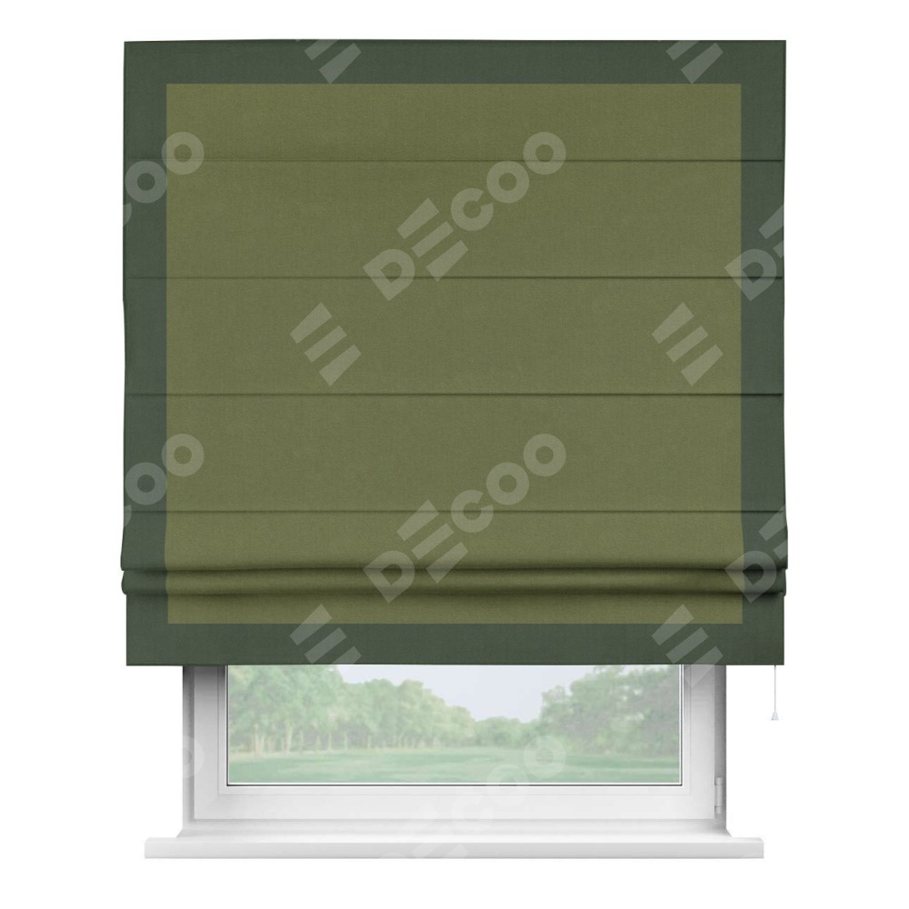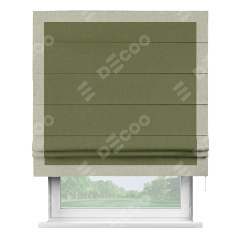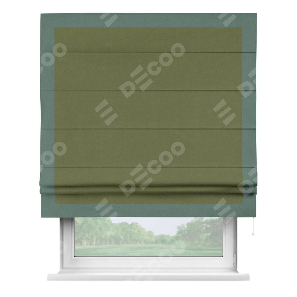 Римская штора производителя «Cortin», используется для проёма, пошита из ткани лён блэкаут оливковый, артикул 69516. Отделка шторы кантом «Чесс», ткань для канта используется из льна разной расцветки на выбор. Имеет универсальный механизм и подходит для монтажа: на потолок, на стену и в нишу.