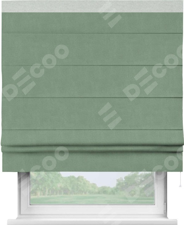 Римская штора производителя «Cortin», используется для проёма, пошита из ткани лён блэкаут светло-бирюзовый, артикул 69443. Отделка шторы кантом «Кинг», ткань для канта используется из льна разной расцветки на выбор. Имеет универсальный механизм и подходит для монтажа: на потолок, на стену и в нишу.