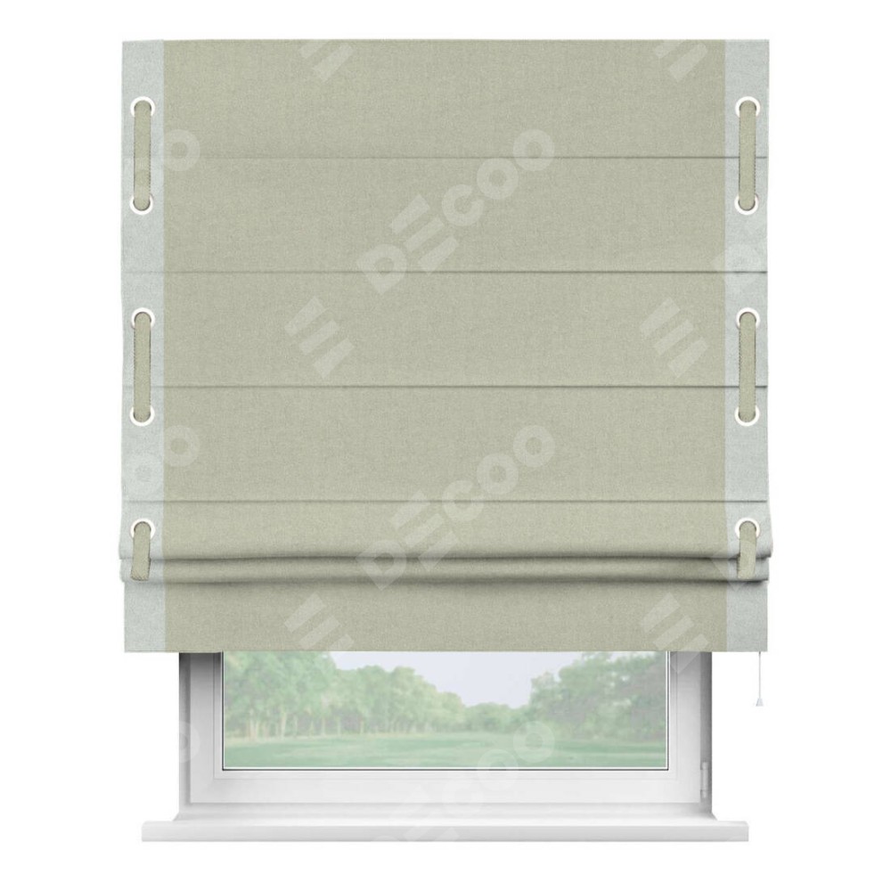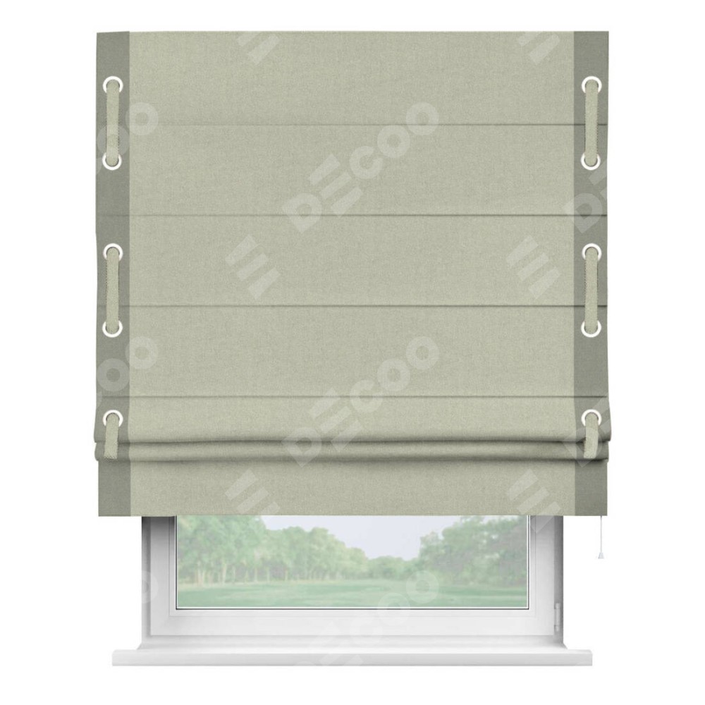 Римская штора производителя «Cortin», используется для проёма, пошита из ткани лён блэкаут серо-бежевый, артикул 69450. Отделка шторы кантом «Стрим Дуо» на кантах расположены люверсы с пояском, ткань для канта используется из льна разной расцветки на выбор. Ткань для пояска обычно используется из основной ткани шторы, а так же можно сделать из любой расцветки по желанию. Имеет универсальный механизм и подходит для монтажа: на потолок, на стену и в нишу.