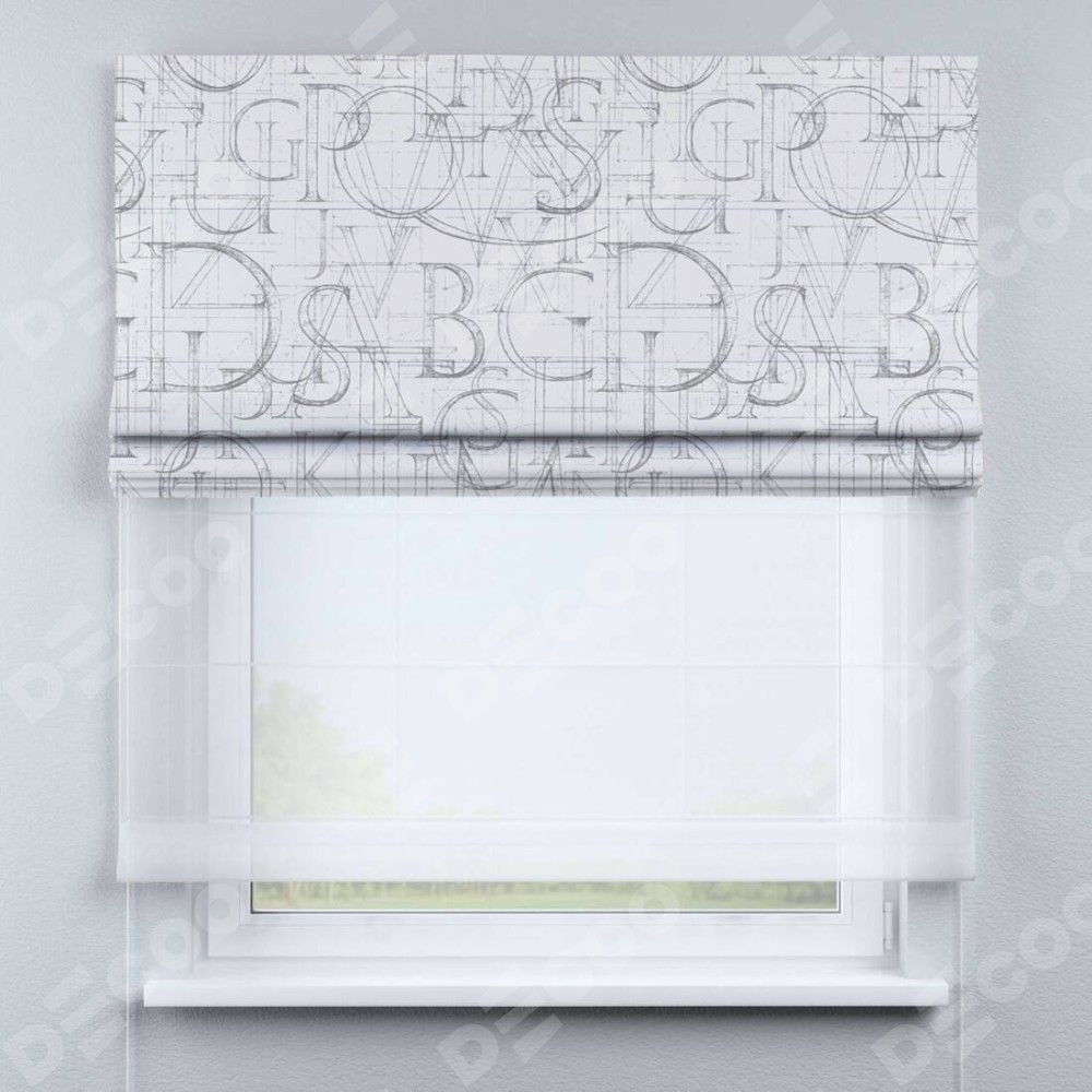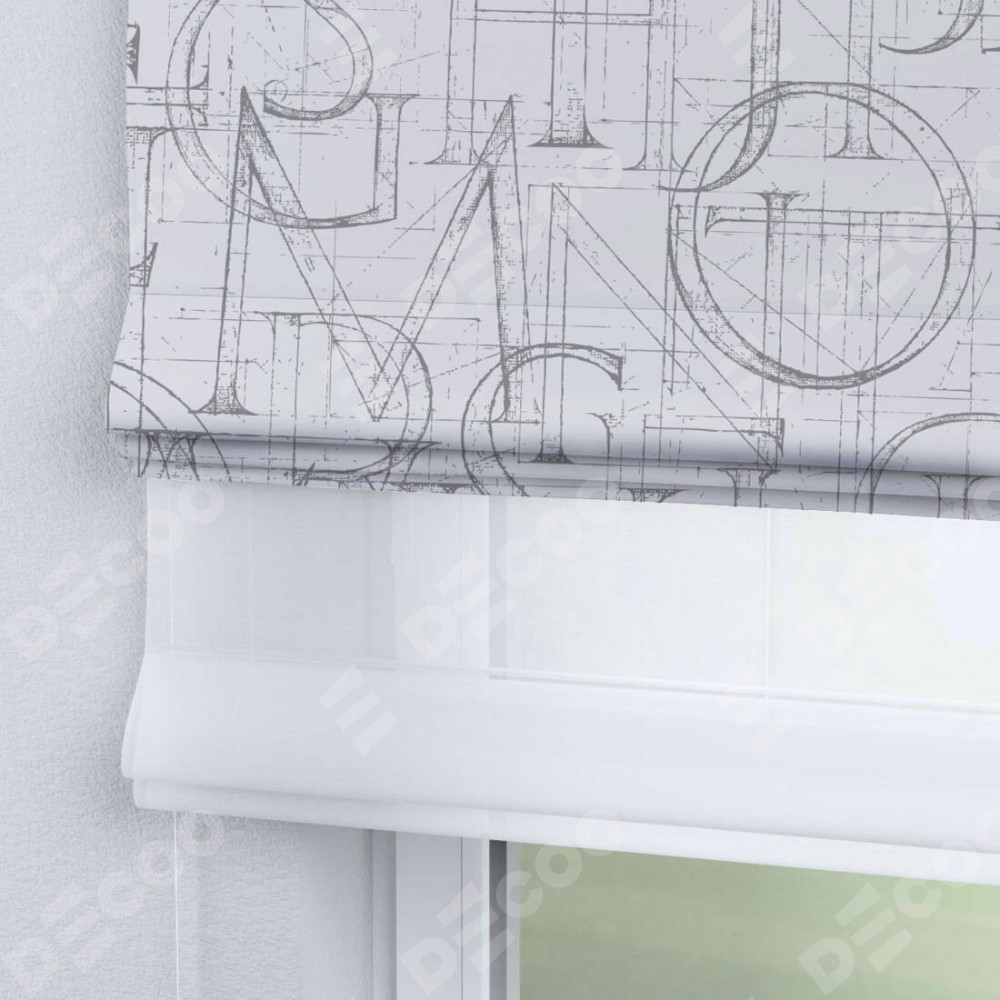 Римская штора день-ночь производителя «Cortin», используется для проёма, пошита из двух полотен, с лицевой блэкаут с нанесением сублимационной печати «Античные буквы», вторая ткань тюль (по стандарту комплектуется тюль белого цвета артикул V-01). Имеет универсальный механизм и подходит для монтажа: на потолок, на стену и в нишу.