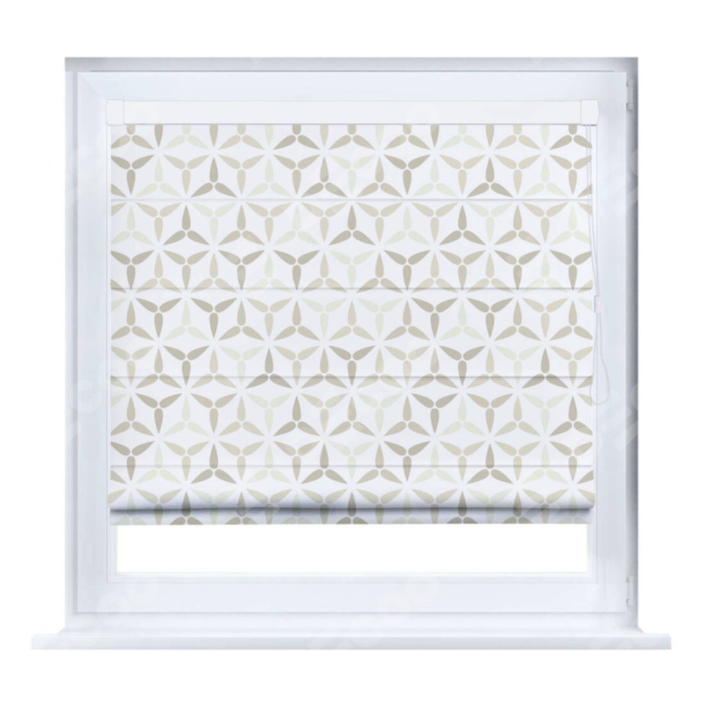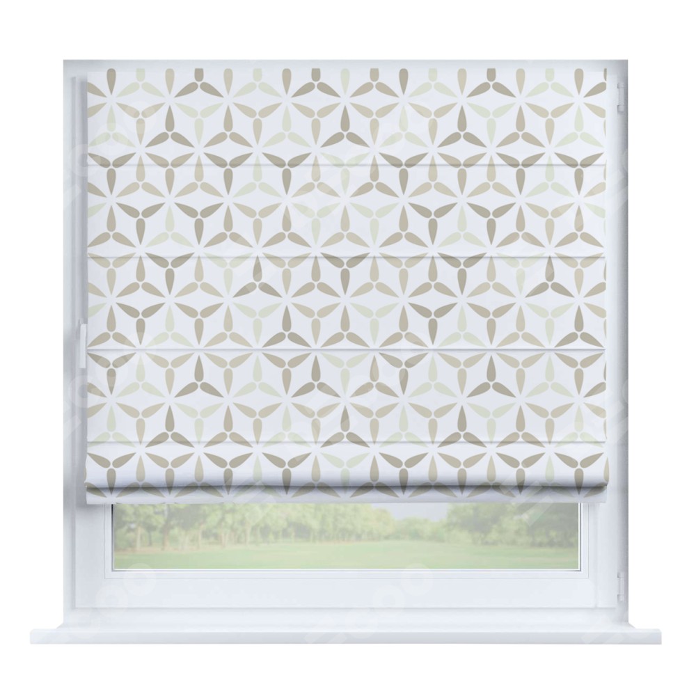 Римская штора производителя «Cortin», устанавливается на створку окна, пошита из ткани блэкаут с нанесением сублимационной печати «Бежевая графика». Штора шьётся по индивидуальным размерам, для данного типа римской шторы возможная ширина от 35 до 150 см., высота до 250 см.