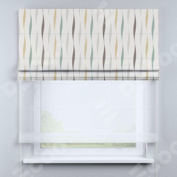 Римская штора день-ночь производителя «Cortin», используется для проёма, пошита из двух полотен, с лицевой блэкаут с нанесением сублимационной печати «Дельта», вторая ткань тюль (по стандарту комплектуется тюль белого цвета артикул V-01). Имеет универсальный механизм и подходит для монтажа: на потолок, на стену и в нишу.