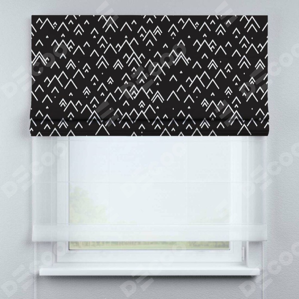 Римская штора день-ночь производителя «Cortin», используется для проёма, пошита из двух полотен, с лицевой блэкаут с нанесением сублимационной печати «Черно-белый минимализм», вторая ткань тюль (по стандарту комплектуется тюль белого цвета артикул V-01). Имеет универсальный механизм и подходит для монтажа: на потолок, на стену и в нишу.