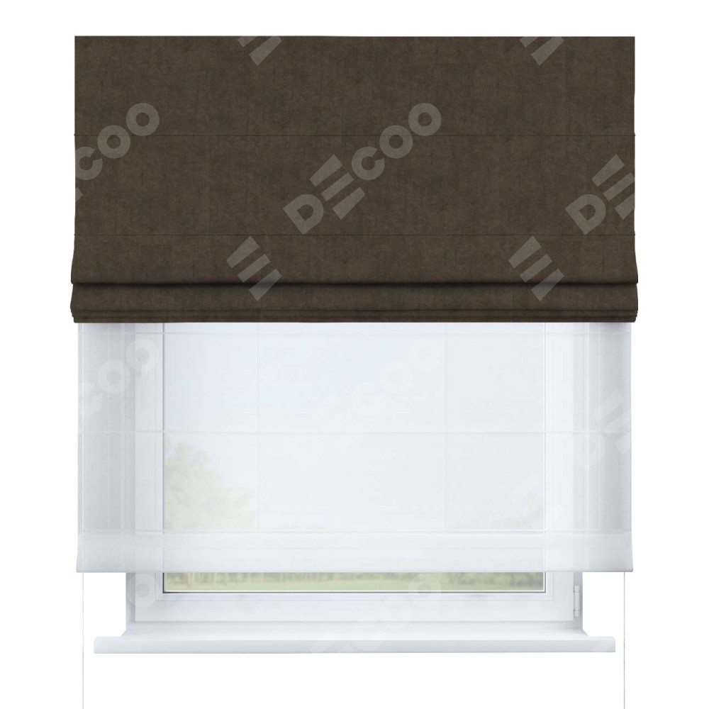 Римская штора день-ночь производителя «Cortin», используется для проёма, пошита из двух полотен, с лицевой стороны канвас коричневый артикул v-29, вторая ткань тюль (по стандарту комплектуется тюль белого цвета артикул V-01). Имеет универсальный механизм и подходит для монтажа: на потолок, на стену и в нишу.