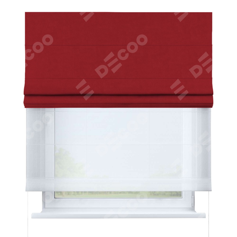 Римская штора день-ночь производителя «Cortin», используется для проёма, пошита из двух полотен, с лицевой стороны канвас красный артикул v-113, вторая ткань тюль (по стандарту комплектуется тюль белого цвета артикул V-01). Имеет универсальный механизм и подходит для монтажа: на потолок, на стену и в нишу.