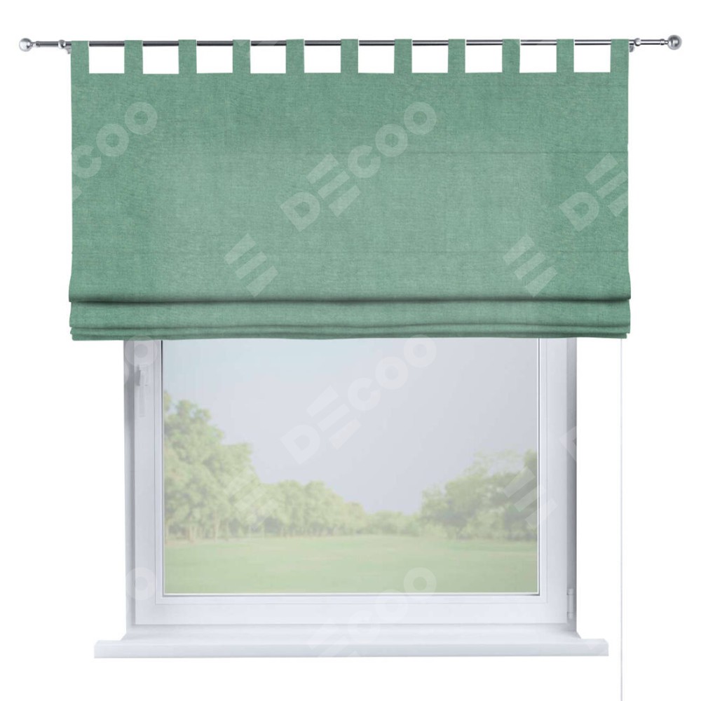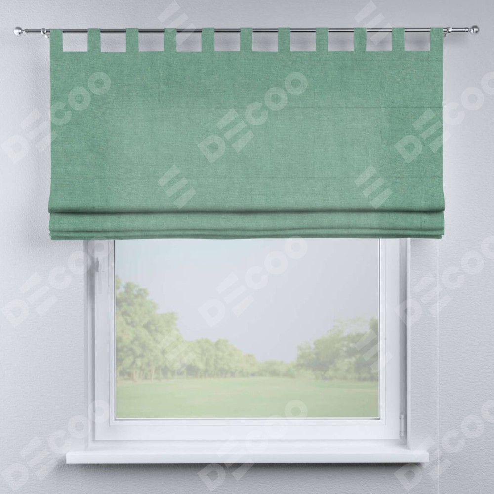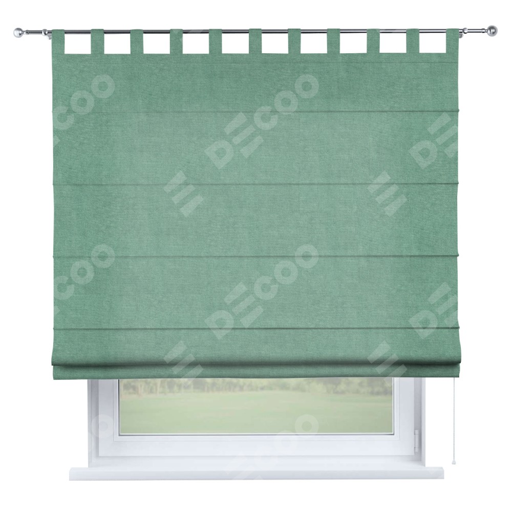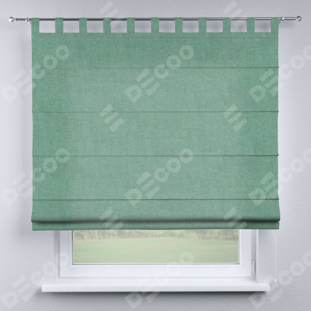 Римская штора производителя «Cortin», используется для проёма, пошита из ткани канвас мятный, артикул ткани v-248. Данная модель пошита на петлях, комплектуется на выбор круглым карнизом и подходит для монтажа на стену. Римская штора на петлях имеет простую систему регулировки высоты, отличительным преимуществом данной модели является простой способ монтажа. Достаточно повесить ее на трубу и штора готова!