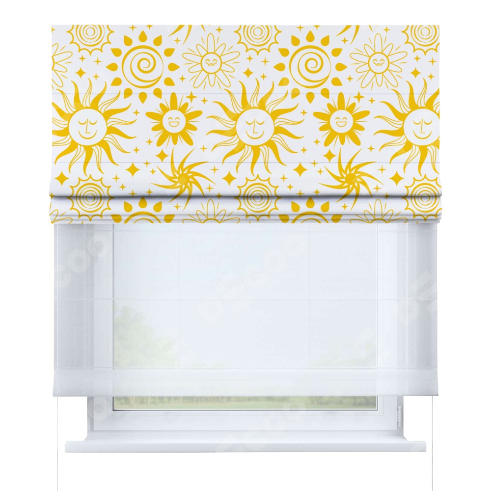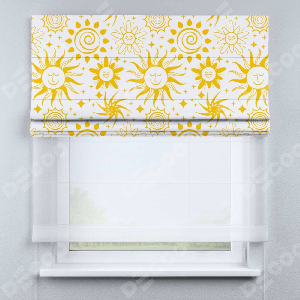 Римская штора день-ночь производителя «Cortin», используется для проёма, пошита из двух полотен, с лицевой блэкаут с нанесением сублимационной печати «Солнышки», вторая ткань тюль (по стандарту комплектуется тюль белого цвета артикул V-01). Имеет универсальный механизм и подходит для монтажа: на потолок, на стену и в нишу.