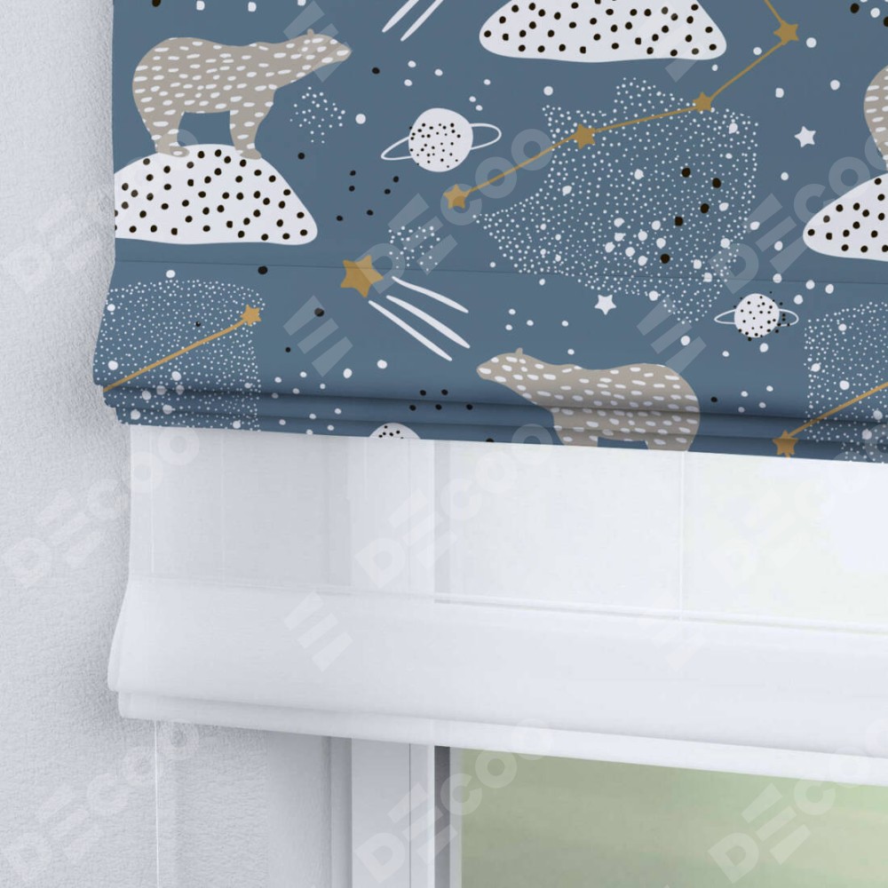 Римская штора день-ночь производителя «Cortin», используется для проёма, пошита из двух полотен, с лицевой блэкаут с нанесением сублимационной печати «Белые медведи», вторая ткань тюль (по стандарту комплектуется тюль белого цвета артикул V-01). Имеет универсальный механизм и подходит для монтажа: на потолок, на стену и в нишу.