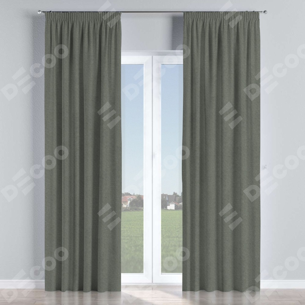 Комплект прямых штор, от производителя «Cortin», пошиты из ткани лён димаут тёмно-серый, артикул ткани 91011. С изнаночной стороны в верхней части штор пристрачивается шторная лента с декоративными складками «Карандаш». Для создания элегантных складок прямые шторы шьются по стандарту с коэффициентом 1:2 (на 100 см. ширины проёма 200 см. ширины ткани).