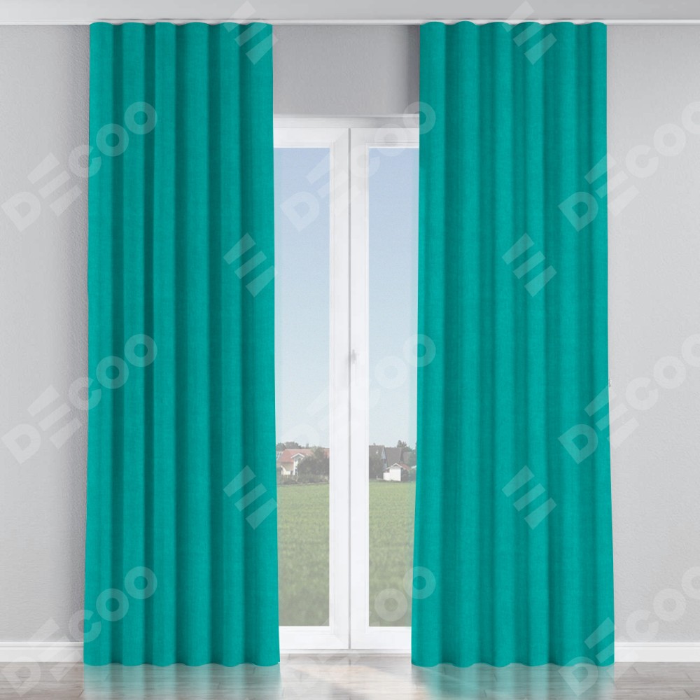 Комплект прямых штор, от производителя «Cortin», пошиты из ткани канвас бирюзовый, артикул ткани v-1048. С изнаночной стороны в верхней части штор пристрачивается шторная лента с декоративными складками «Волна». Для создания элегантных складок прямые шторы шьются по стандарту с коэффициентом 1:2 (на 100 см. ширины проёма 200 см. ширины ткани).