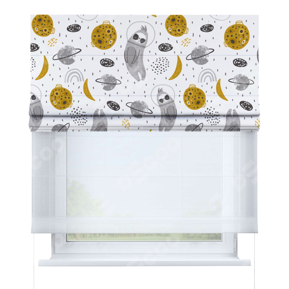Римская штора день-ночь производителя «Cortin», используется для проёма, пошита из двух полотен, с лицевой блэкаут с нанесением сублимационной печати «Ленивец в шлеме», вторая ткань тюль (по стандарту комплектуется тюль белого цвета артикул V-01). Имеет универсальный механизм и подходит для монтажа: на потолок, на стену и в нишу.
