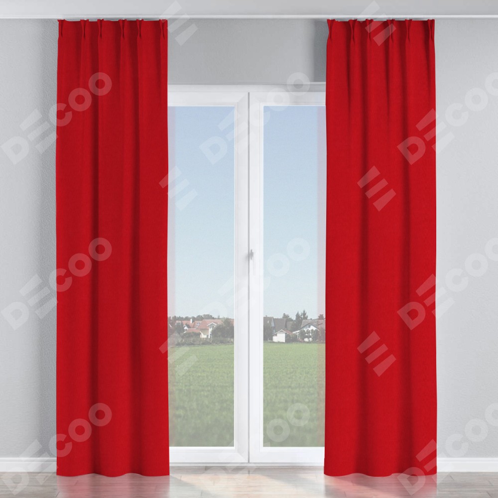 Комплект прямых штор, от производителя «Cortin», пошиты из ткани канвас красный, артикул ткани v-113. С изнаночной стороны в верхней части штор пристрачивается шторная лента с декоративными складками «Кустик». Для создания элегантных складок прямые шторы шьются по стандарту с коэффициентом 1:2 (на 100 см. ширины проёма 200 см. ширины ткани).