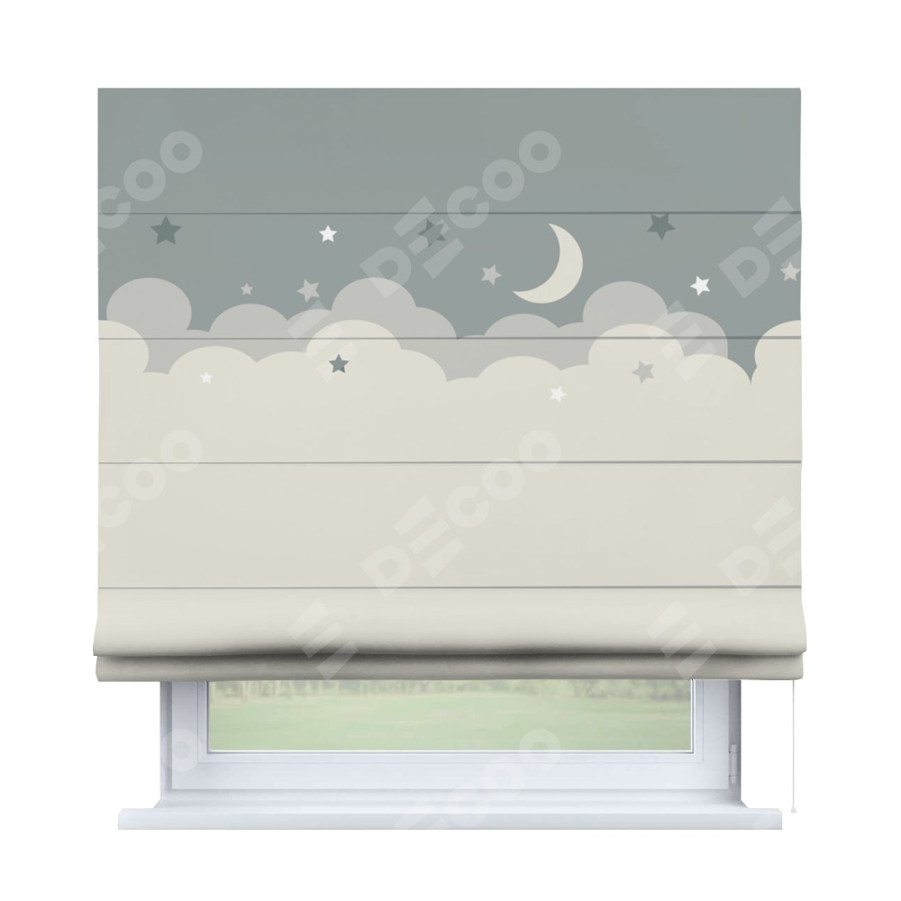 Римская штора производителя «Cortin», используется для проёма, пошита из ткани блэкаут с нанесением сублимационной печати «Ночные облака». Имеет универсальный механизм и подходит для монтажа: на потолок, на стену и в нишу.