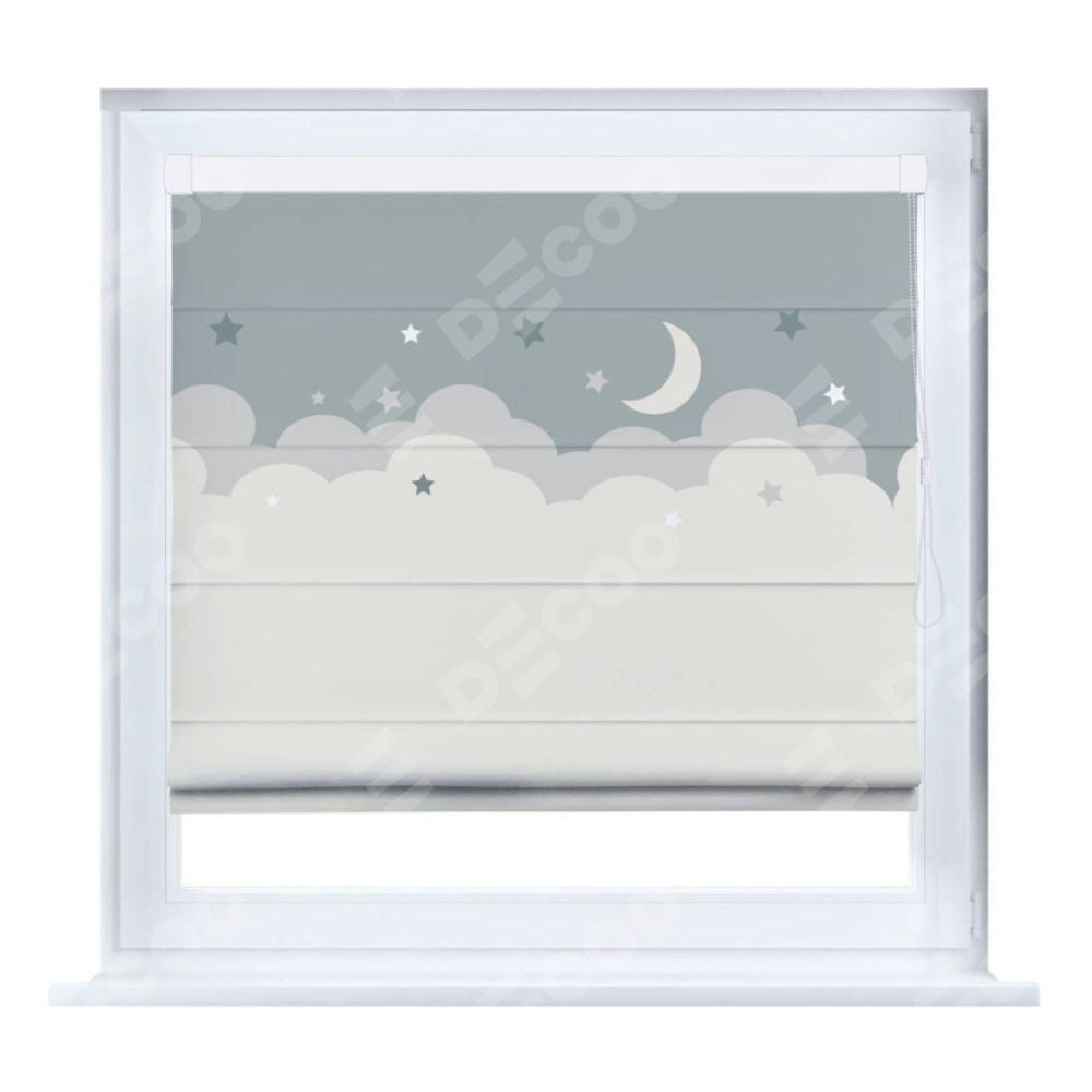 Римская штора производителя «Cortin», устанавливается на створку окна, пошита из ткани блэкаут с нанесением сублимационной печати «Ночные облака». Штора шьётся по индивидуальным размерам, для данного типа римской шторы возможная ширина от 35 до 150 см., высота до 250 см.