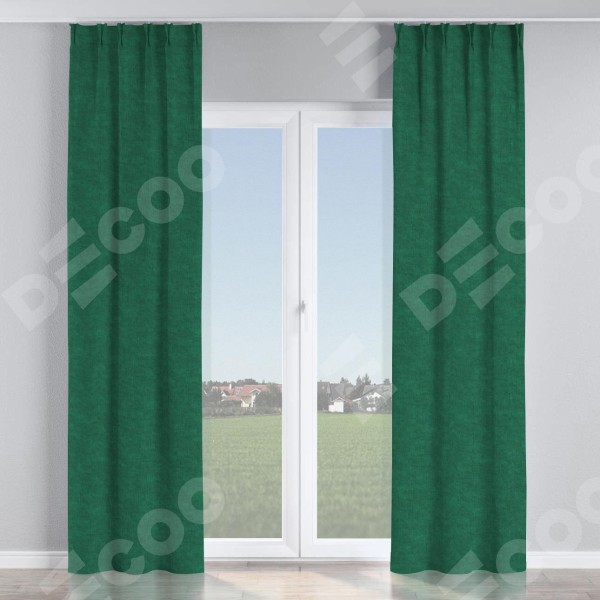 Комплект прямых штор, от производителя «Cortin», пошиты из ткани канвас тёмно-зелёный, артикул ткани v-469. С изнаночной стороны в верхней части штор пристрачивается шторная лента с декоративными складками «Кустик». Для создания элегантных складок прямые шторы шьются по стандарту с коэффициентом 1:2 (на 100 см. ширины проёма 200 см. ширины ткани).