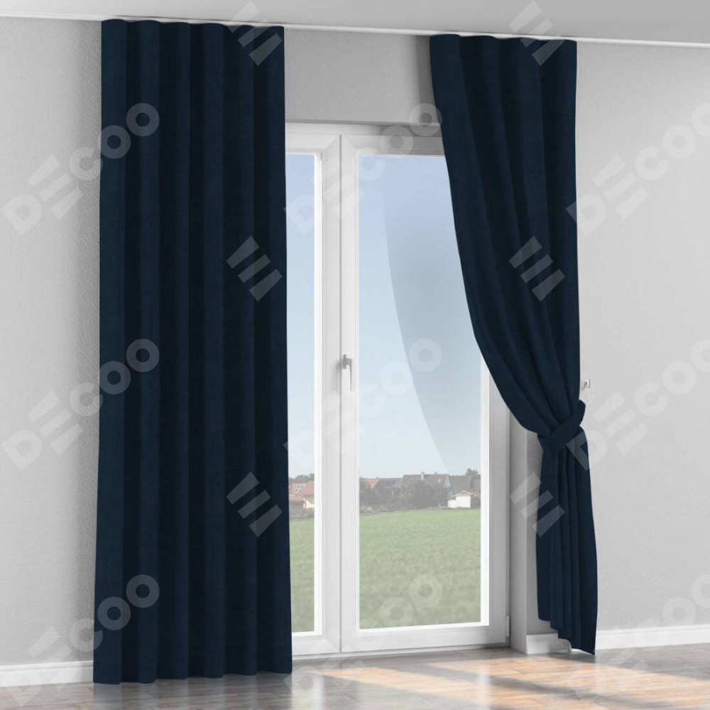 Комплект прямых штор, от производителя «Cortin», пошиты из ткани канвас тёмно-синий, артикул ткани v-206. С изнаночной стороны в верхней части штор пристрачивается шторная лента с декоративными складками «Волна». Для создания элегантных складок прямые шторы шьются по стандарту с коэффициентом 1:2 (на 100 см. ширины проёма 200 см. ширины ткани).