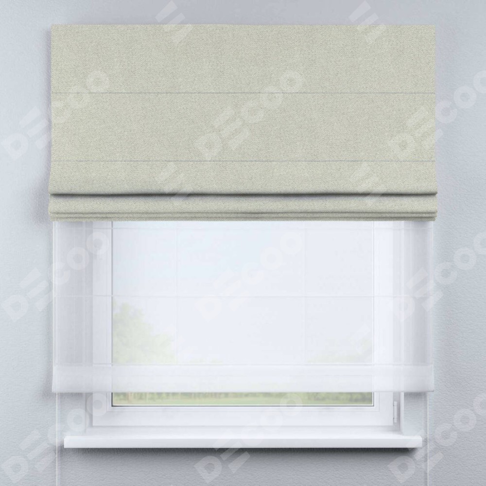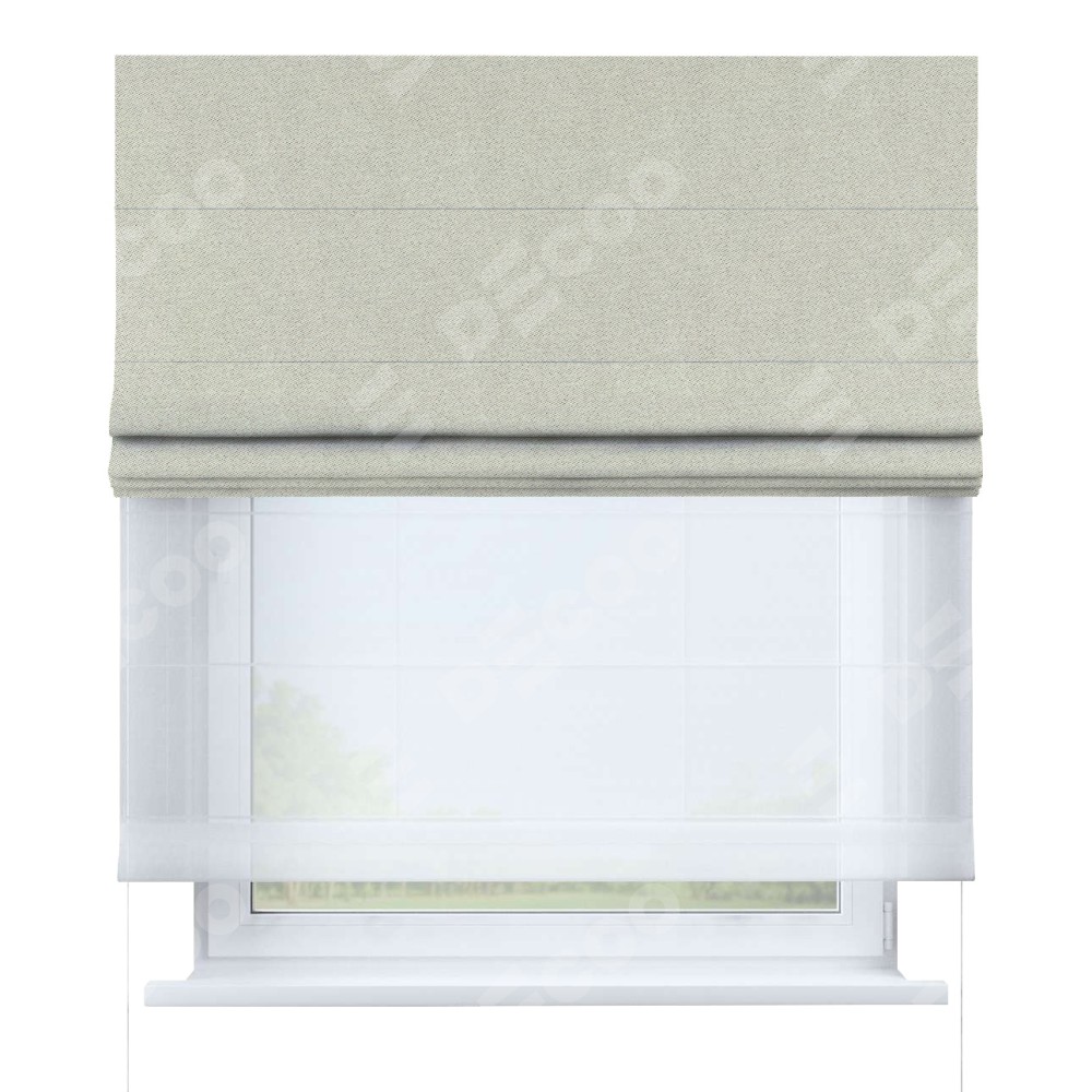 Римская штора день-ночь производителя «Cortin», используется для проёма, пошита из двух полотен, с лицевой стороны твид блэкаут шампань артикул 90929, вторая ткань тюль (по стандарту комплектуется тюль белого цвета артикул V-01). Имеет универсальный механизм и подходит для монтажа: на потолок, на стену и в нишу.