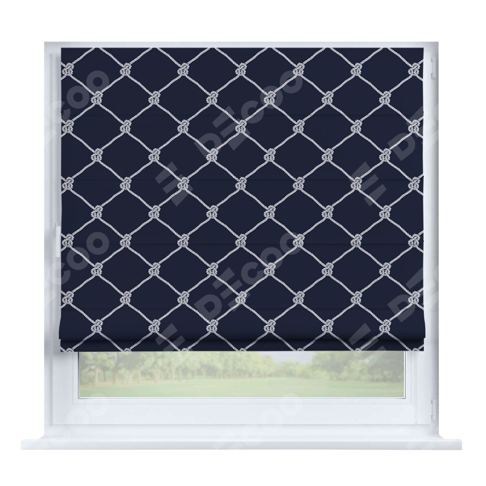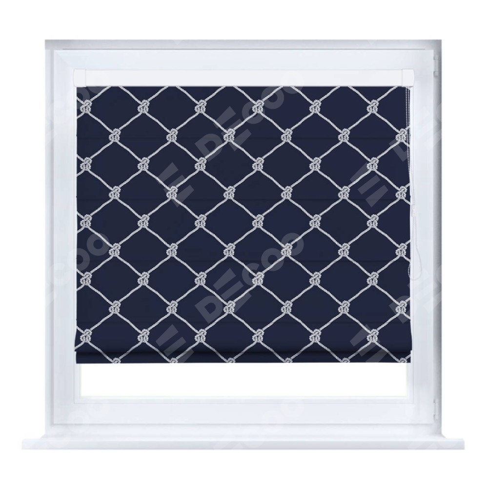 Римская штора производителя «Cortin», устанавливается на створку окна, пошита из ткани блэкаут с нанесением сублимационной печати «Морские веревки». Штора шьётся по индивидуальным размерам, для данного типа римской шторы возможная ширина от 35 до 150 см., высота до 250 см.