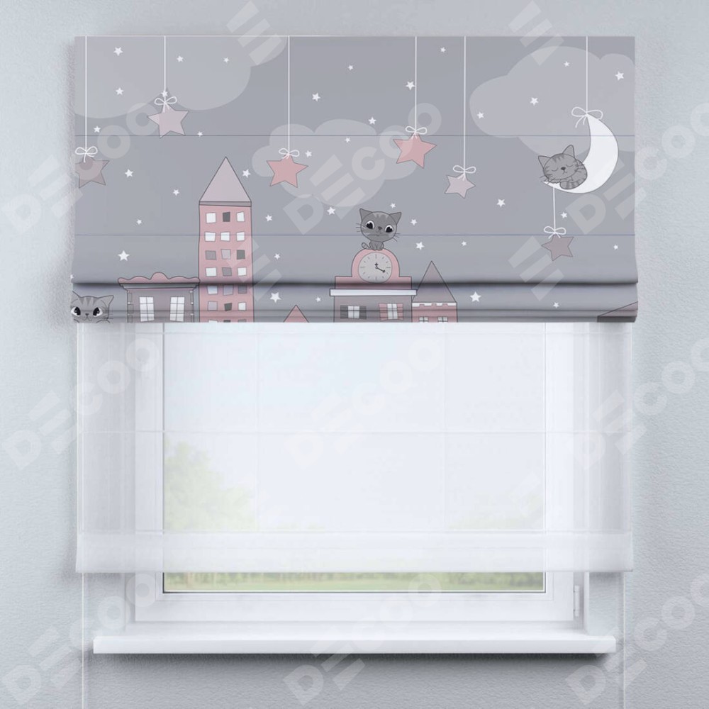 Римская штора день-ночь производителя «Cortin», используется для проёма, пошита из двух полотен, с лицевой блэкаут с нанесением сублимационной печати «Вечерний город», вторая ткань тюль (по стандарту комплектуется тюль белого цвета артикул V-01). Имеет универсальный механизм и подходит для монтажа: на потолок, на стену и в нишу.
