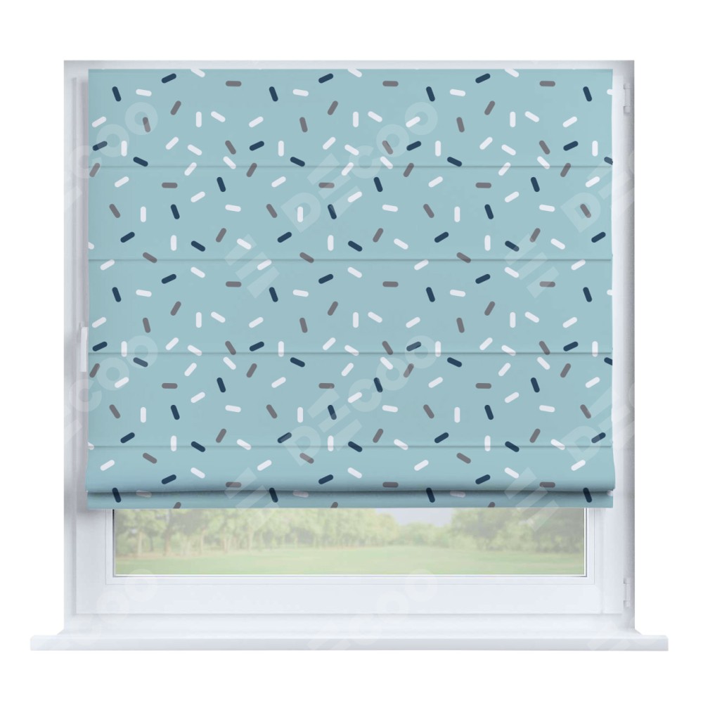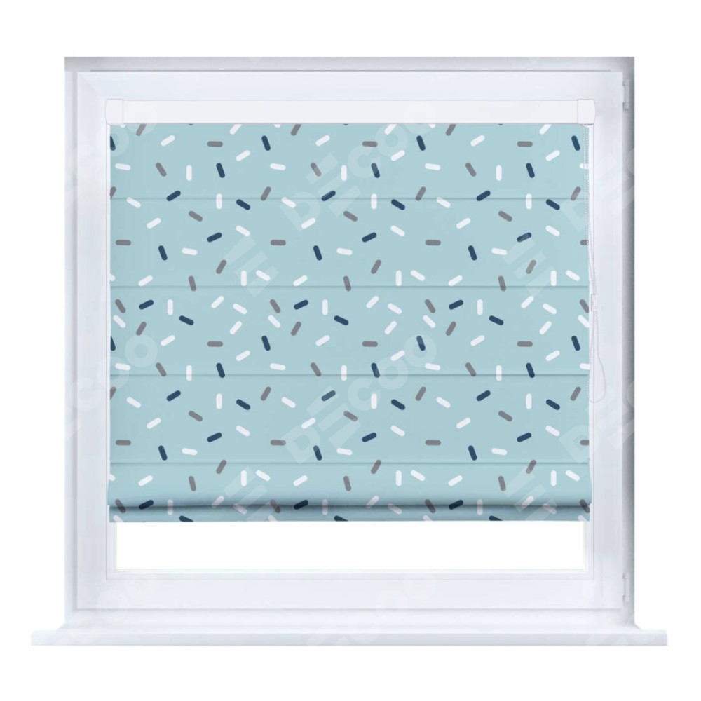 Римская штора производителя «Cortin», устанавливается на створку окна, пошита из ткани блэкаут с нанесением сублимационной печати «Короткие линии». Штора шьётся по индивидуальным размерам, для данного типа римской шторы возможная ширина от 35 до 150 см., высота до 250 см.