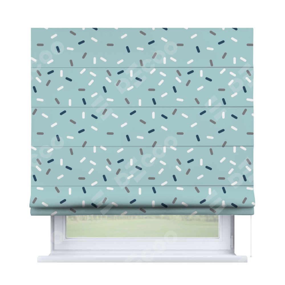 Римская штора производителя «Cortin», используется для проёма, пошита из ткани блэкаут с нанесением сублимационной печати «Короткие линии». Имеет универсальный механизм и подходит для монтажа: на потолок, на стену и в нишу.