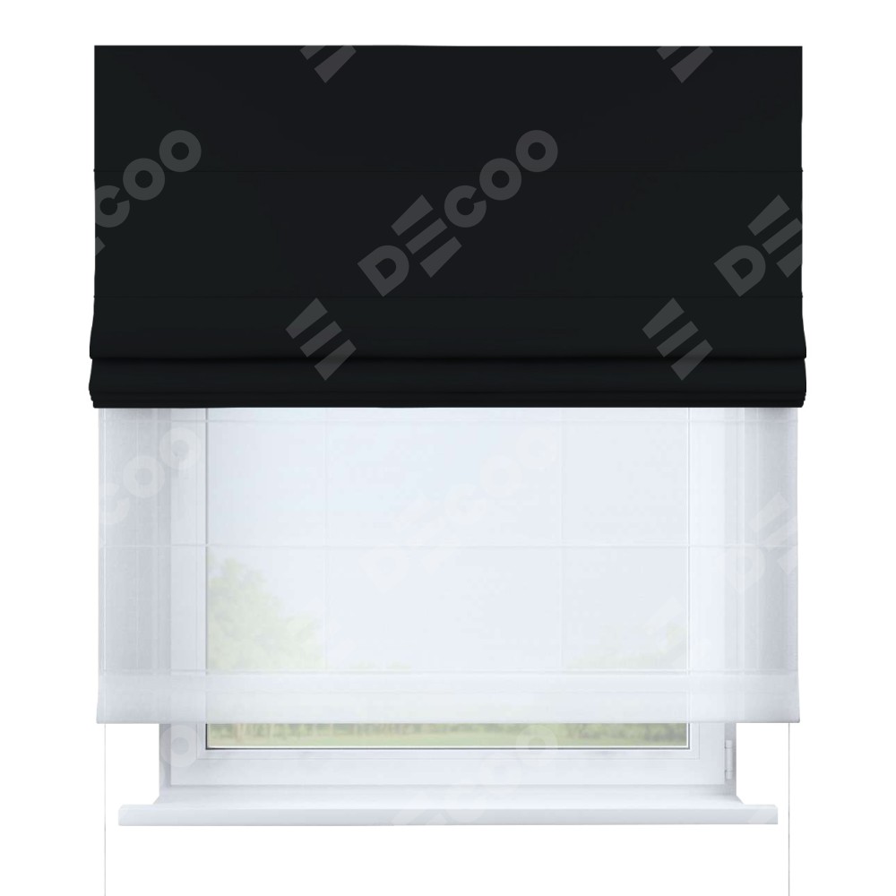 Двойная римская штора «День-ночь» от производителя Cortin предназначена для использования в проёмах. Эта штора уникальна тем, что состоит из двух полотен. На лицевой стороне находится однотонный черный блэкаут (артикул: 91571−2), обеспечивающий эффективное затемнение. В комплект также входит вторая ткань — легкий белый тюль (артикул: V-01), который добавляет изящества и легкости оформлению окна. Кроме того, доступны и другие разновидности ткани тюль, выбор которых доступен по  ссылке .
