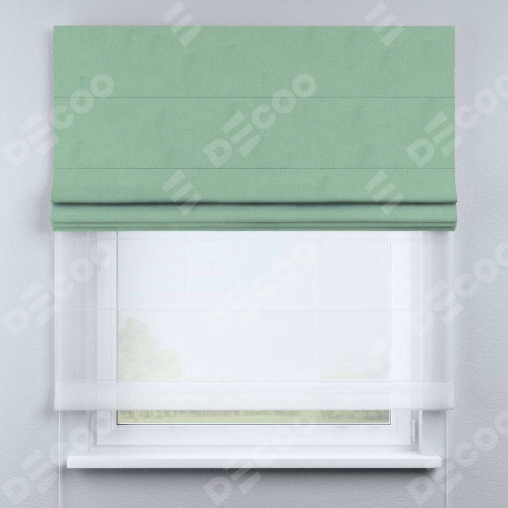 Двойная римская штора «День-ночь» от производителя Cortin предназначена для использования в проёмах. Эта штора уникальна тем, что состоит из двух полотен. На лицевой стороне находится однотонный ментоловый блэкаут (артикул: 91572−1), обеспечивающий эффективное затемнение. В комплект также входит вторая ткань — легкий белый тюль (артикул: V-01), который добавляет изящества и легкости оформлению окна. Кроме того, доступны и другие разновидности ткани тюль, выбор которых доступен по  ссылке .