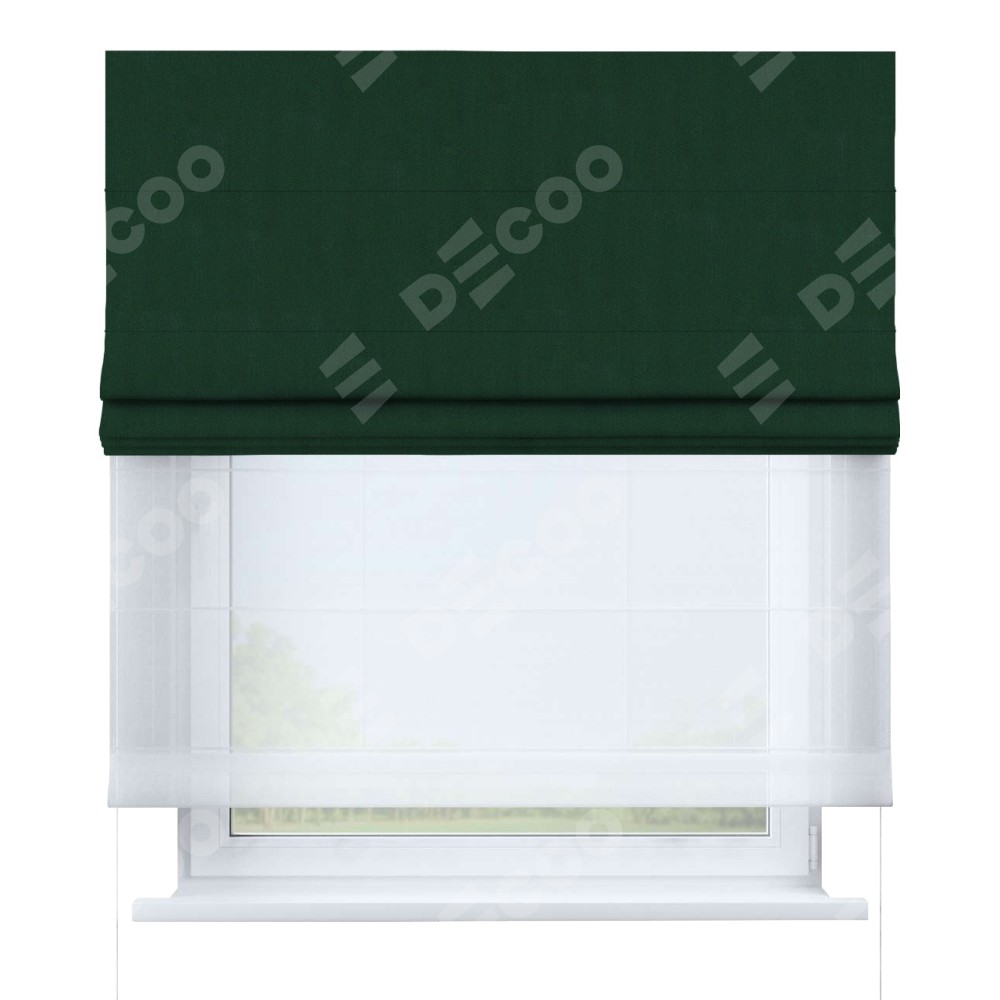 Двойная римская штора «День-ночь» от производителя Cortin предназначена для использования в проёмах. Эта штора уникальна тем, что состоит из двух полотен. На лицевой стороне находится однотонный зелёный блэкаут (артикул: 91572−2), обеспечивающий эффективное затемнение. В комплект также входит вторая ткань — легкий белый тюль (артикул: V-01), который добавляет изящества и легкости оформлению окна. Кроме того, доступны и другие разновидности ткани тюль, выбор которых доступен по  ссылке .