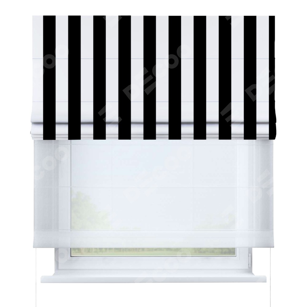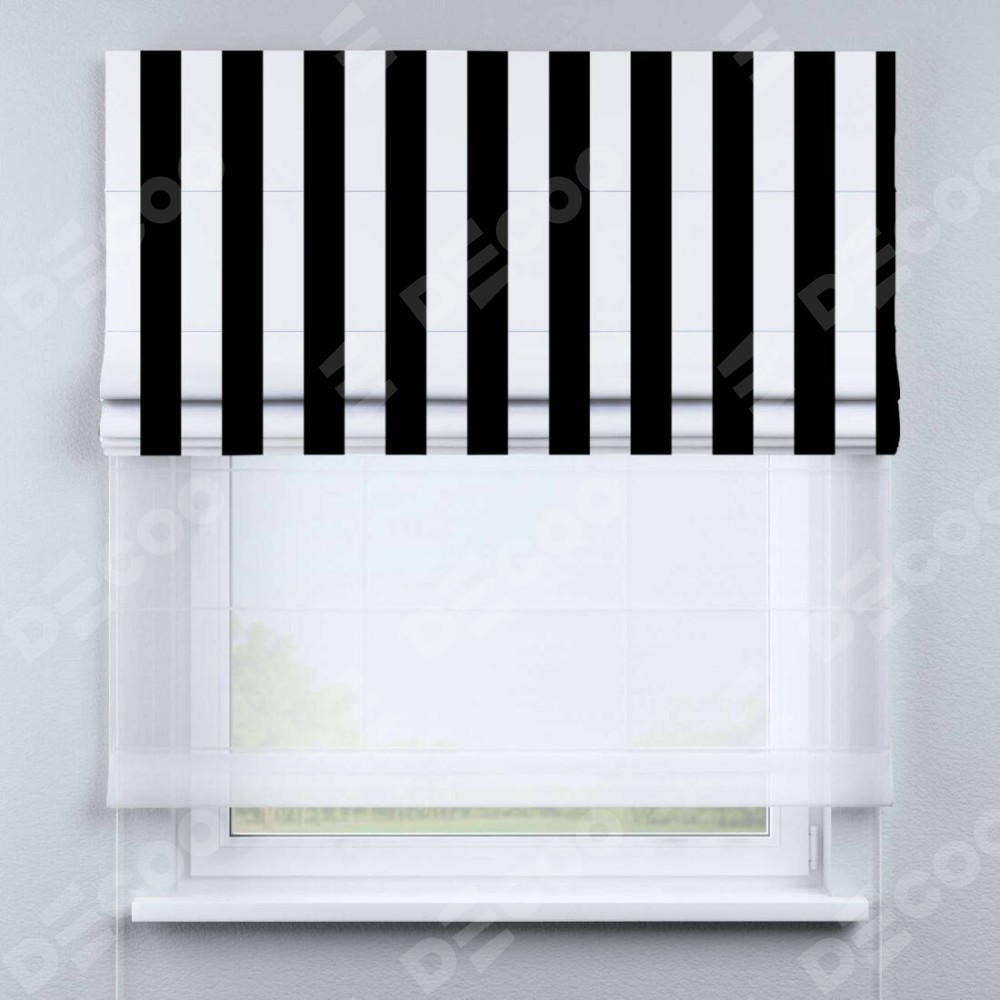 Двойная римская штора «День-ночь» от производителя Cortin предназначена для использования в проёмах. Эта штора уникальна тем, что состоит из двух полотен. На лицевой стороне находится блэкаут с нанесением сублимационной печати «Черное и белое», обеспечивающий эффективное затемнение. В комплект также входит вторая ткань — легкий белый тюль (артикул: V-01), который добавляет изящества и легкости оформлению окна. Кроме того, доступны и другие разновидности ткани тюль, выбор которых доступен по  ссылке .