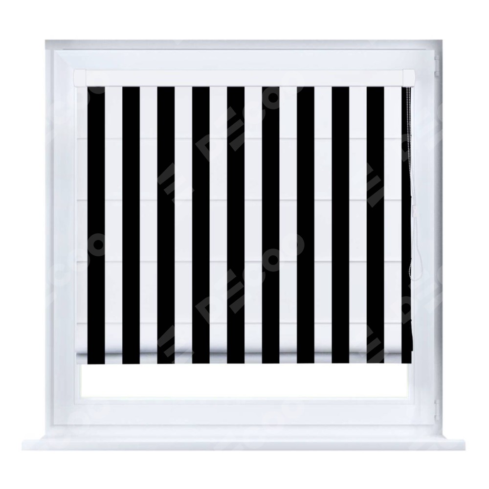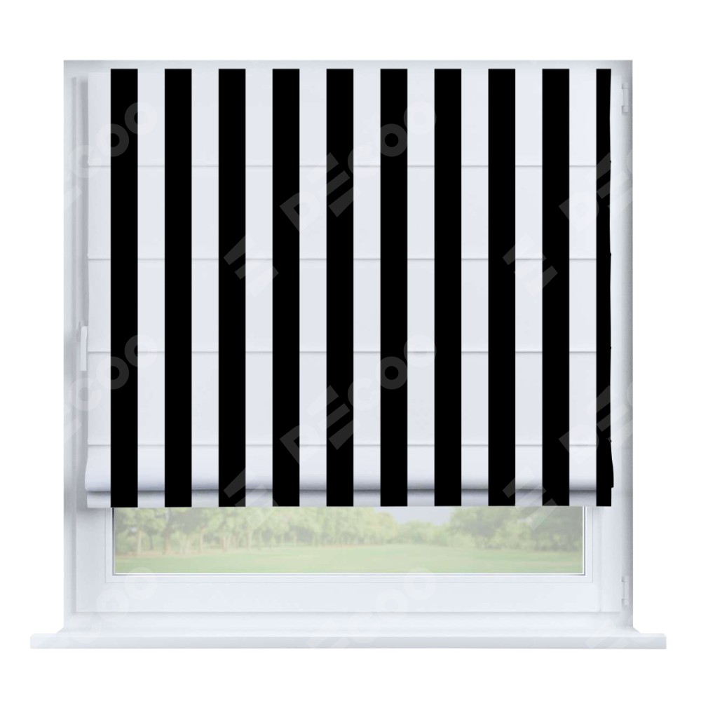 Римская штора производителя «Cortin», устанавливается на створку окна, пошита из ткани блэкаут с нанесением сублимационной печати «Черное и белое». Штора шьётся по индивидуальным размерам, для данного типа римской шторы возможная ширина от 35 до 150 см., высота до 250 см.