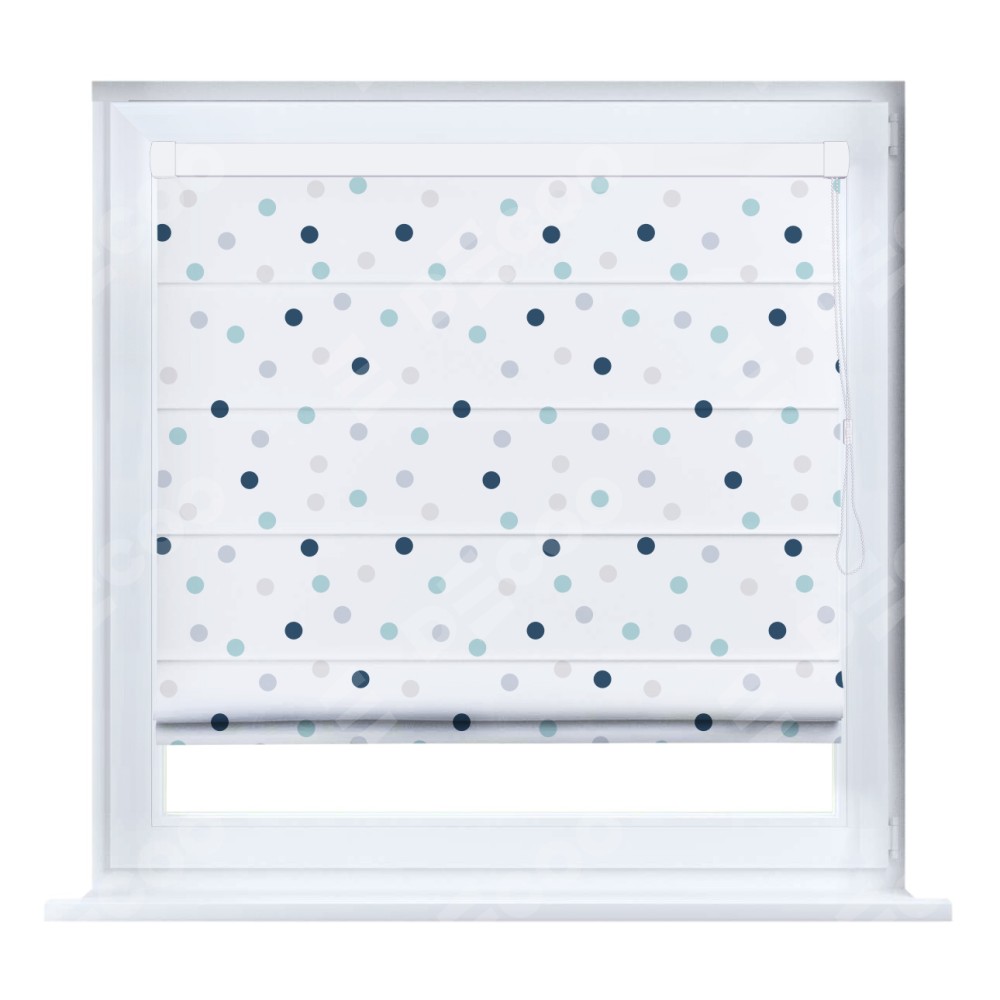 Римская штора кассетного типа, производителя «Cortin», устанавливается только на пластиковые окна и прилегает к стеклопакету, пошита из ткани блэкаут с нанесением сублимационной печати «Точки».