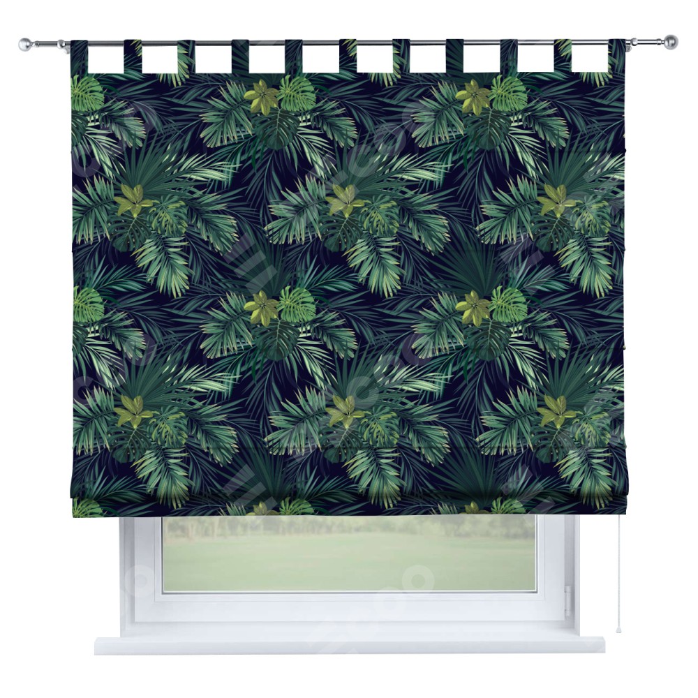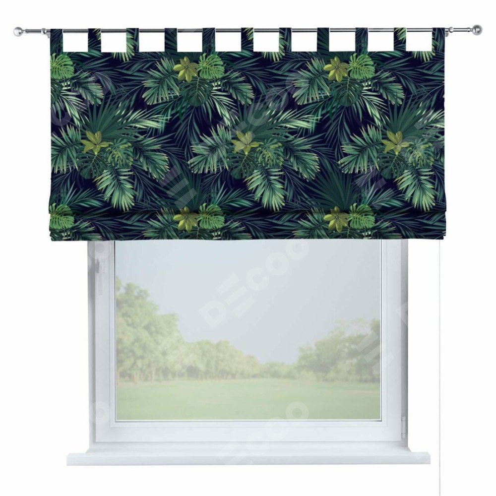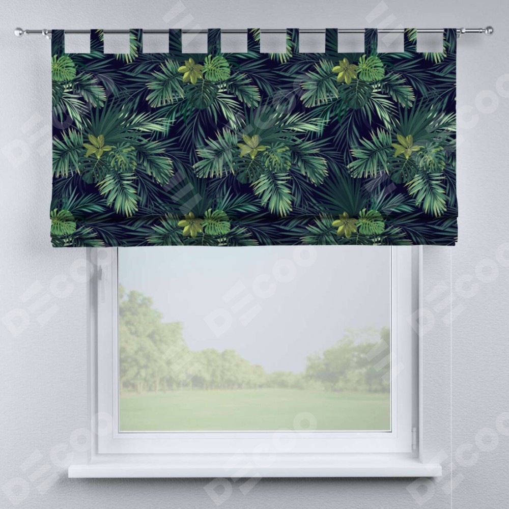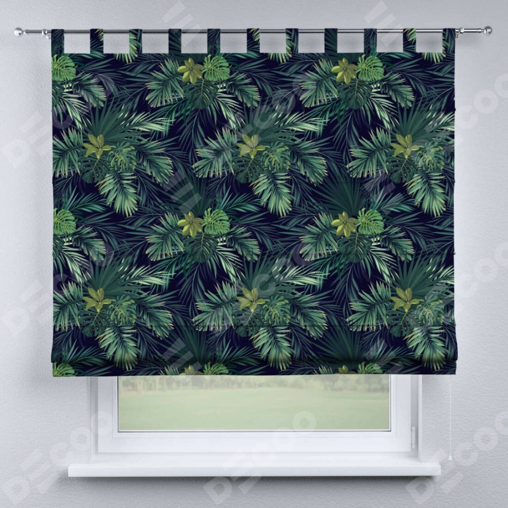 Римская штора производителя «Cortin», используется для проёма, пошита из ткани блэкаут с нанесением сублимационной печати «Пальмовые листья». Данная модель пошита на петлях, комплектуется на выбор круглым карнизом и подходит для монтажа на стену. Римская штора на петлях имеет простую систему регулировки высоты, отличительным преимуществом данной модели является простой способ монтажа. Достаточно повесить ее на трубу и штора готова!