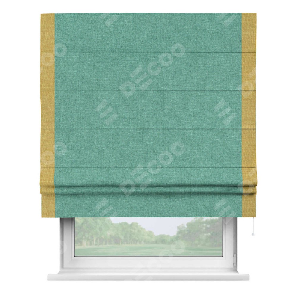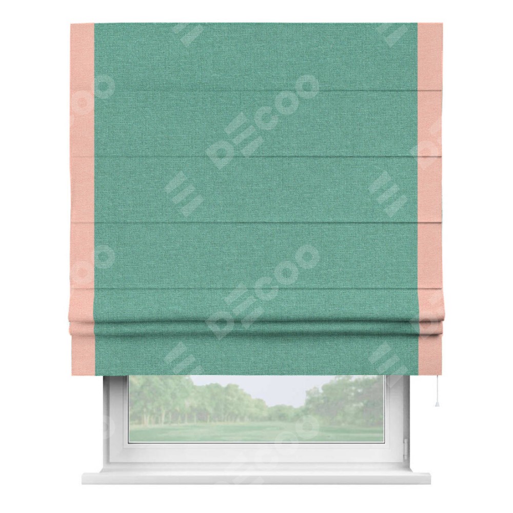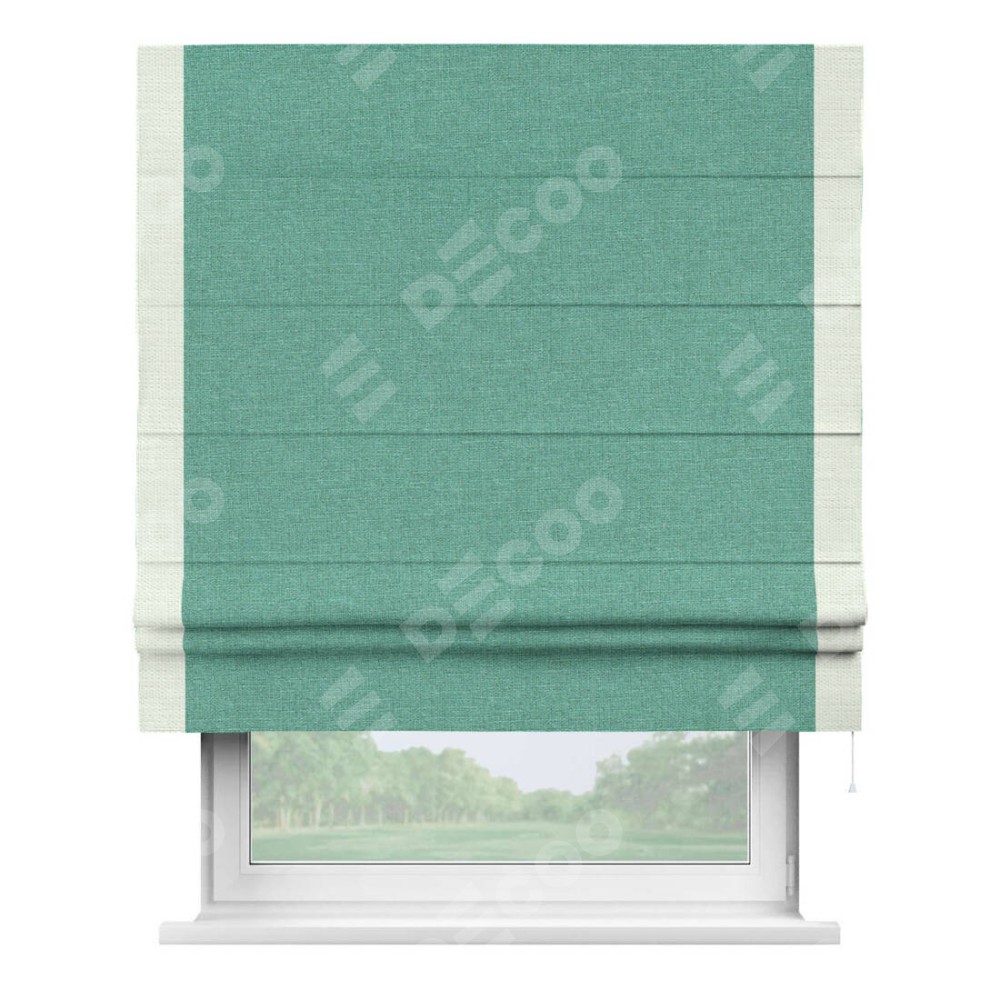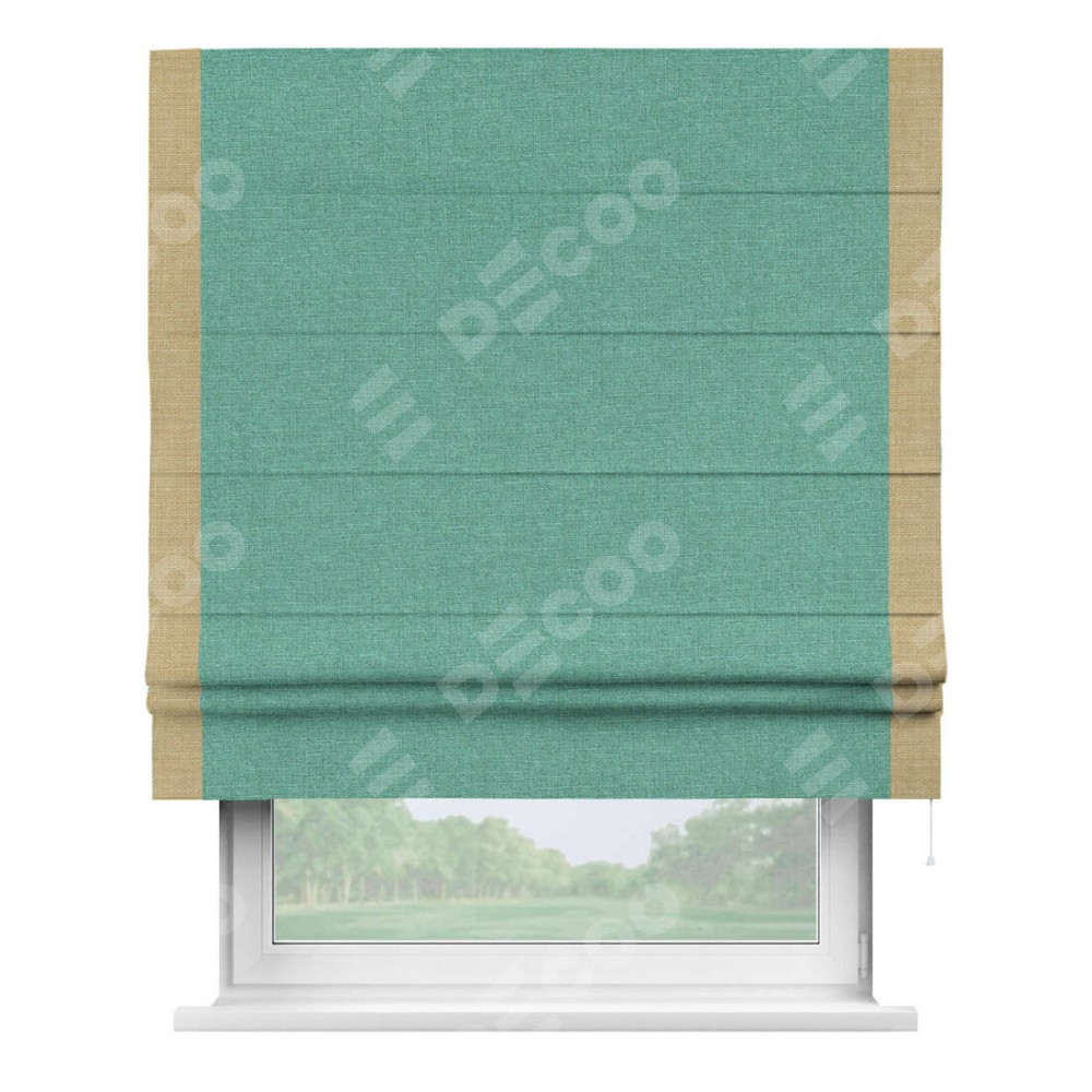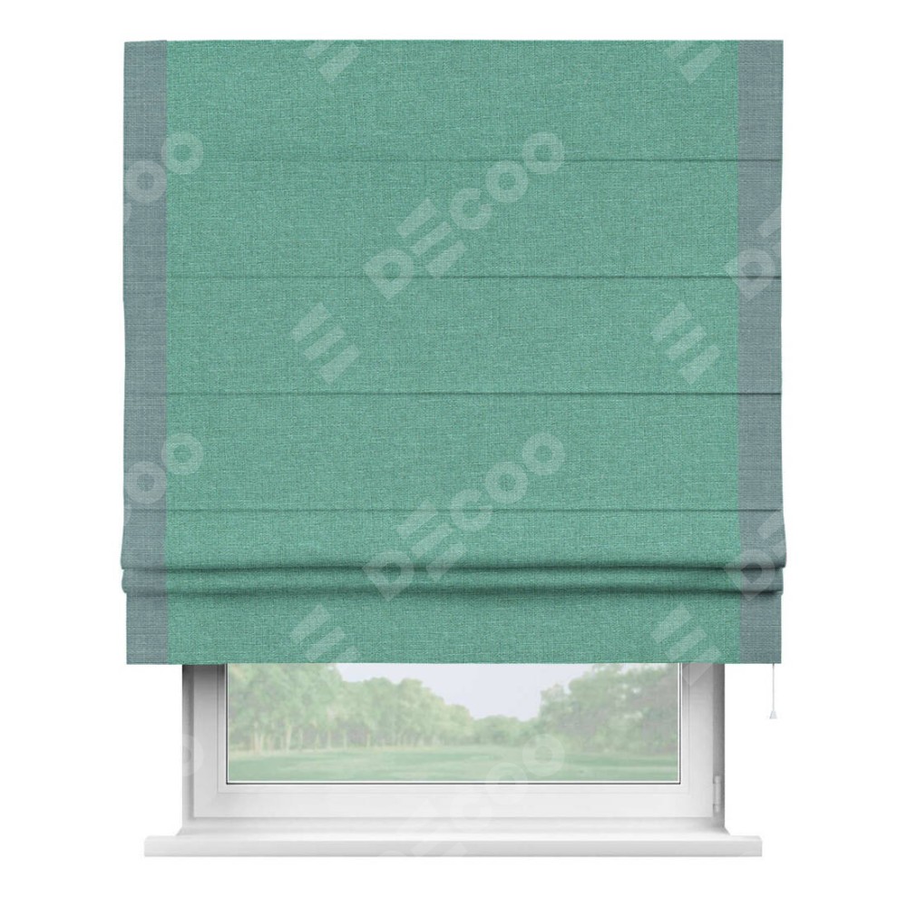 Римская штора производителя «Cortin», используется для проёма, пошита из ткани лён светло-бирюзовый, артикул 53435. Отделка шторы кантом «Стрим Дуо», ткань для канта используется из льна разной расцветки на выбор. Имеет универсальный механизм и подходит для монтажа: на потолок, на стену и в нишу.