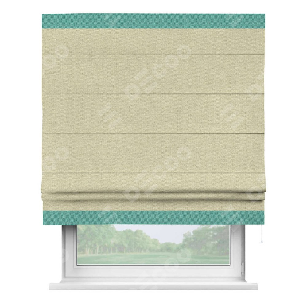 Римская штора производителя «Cortin», используется для проёма, пошита из ткани лён димаут шампань, артикул 90994. Отделка шторы кантом «Горизонт», ткань для канта используется из льна димаут разной расцветки на выбор. Имеет универсальный механизм и подходит для монтажа: на потолок, на стену и в нишу.