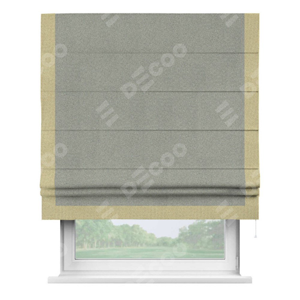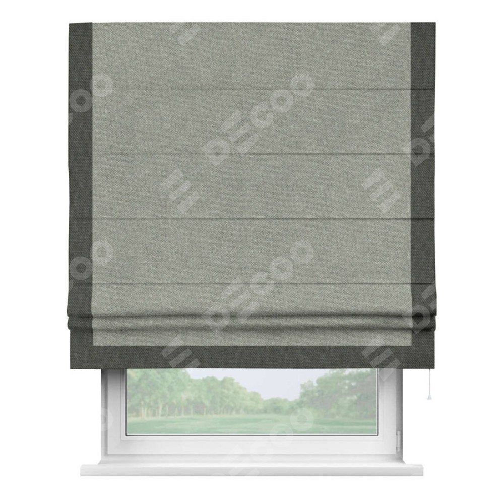 Римская штора производителя «Cortin», используется для проёма, пошита из ткани лён димаут серый, артикул 91009. Отделка шторы кантом «Виктория», ткань для канта используется из льна димаут разной расцветки на выбор. Имеет универсальный механизм и подходит для монтажа: на потолок, на стену и в нишу.