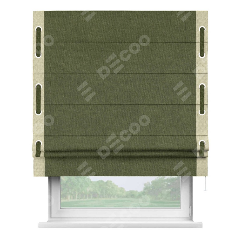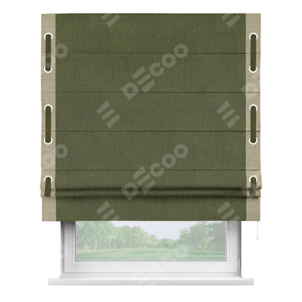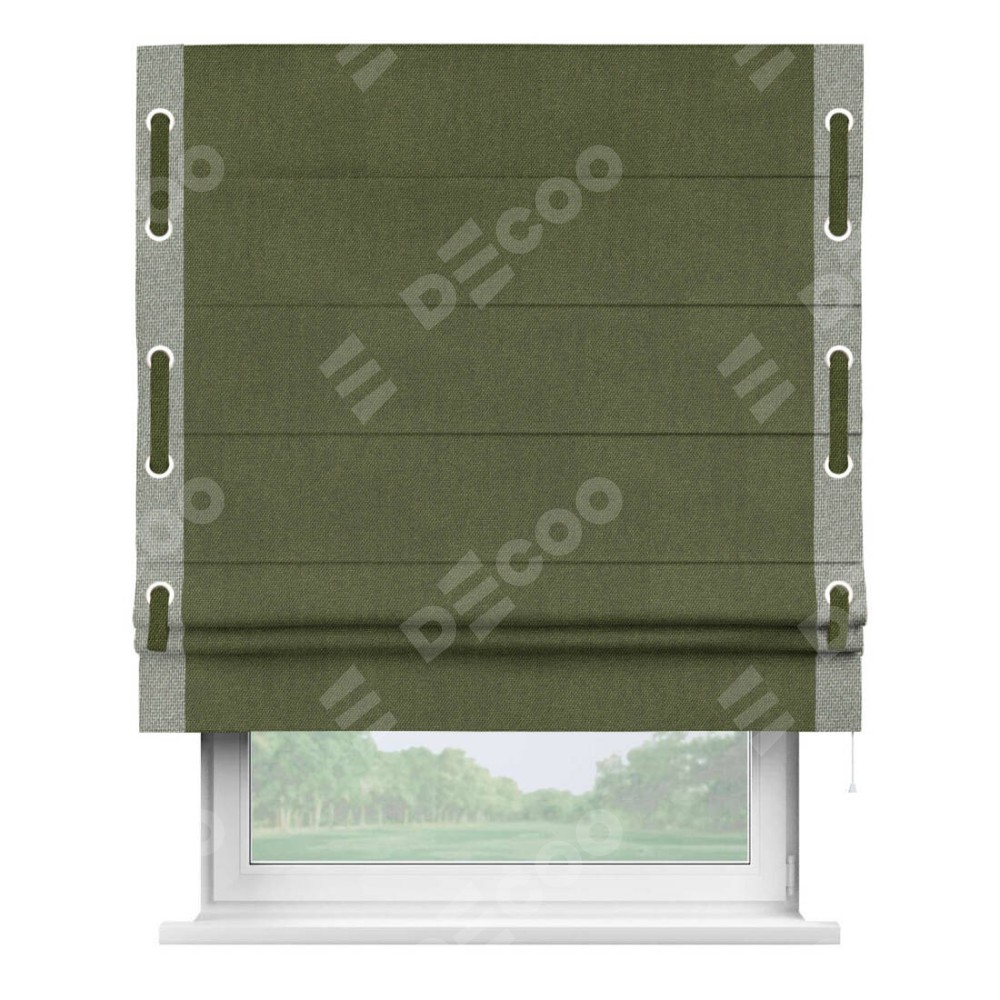 Римская штора производителя «Cortin», используется для проёма, пошита из ткани лён димаут салатовый, артикул 91002. Отделка шторы кантом «Стрим Дуо» на кантах расположены люверсы с пояском, ткань для канта используется лён димаут разной расцветки на выбор. Ткань для пояска обычно используется из основной ткани шторы, а так же можно сделать из любой расцветки по желанию. Имеет универсальный механизм и подходит для монтажа: на потолок, на стену и в нишу.