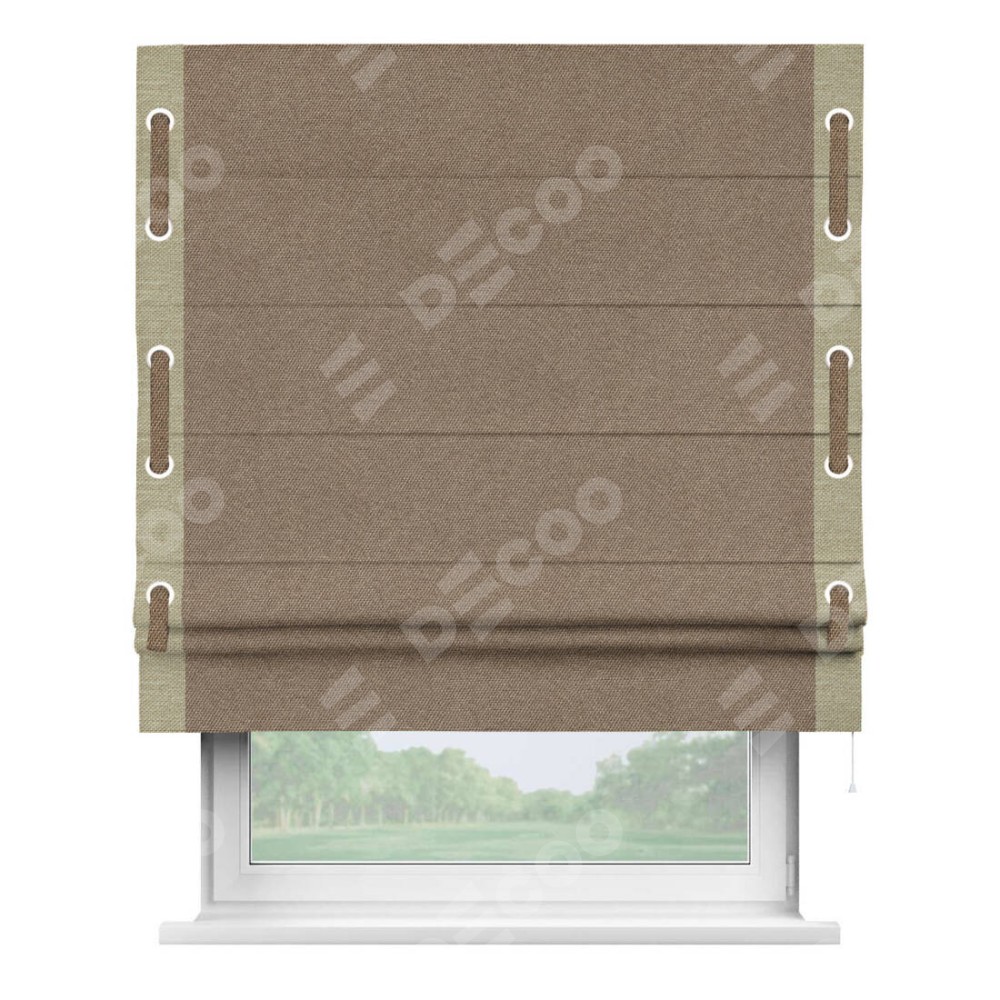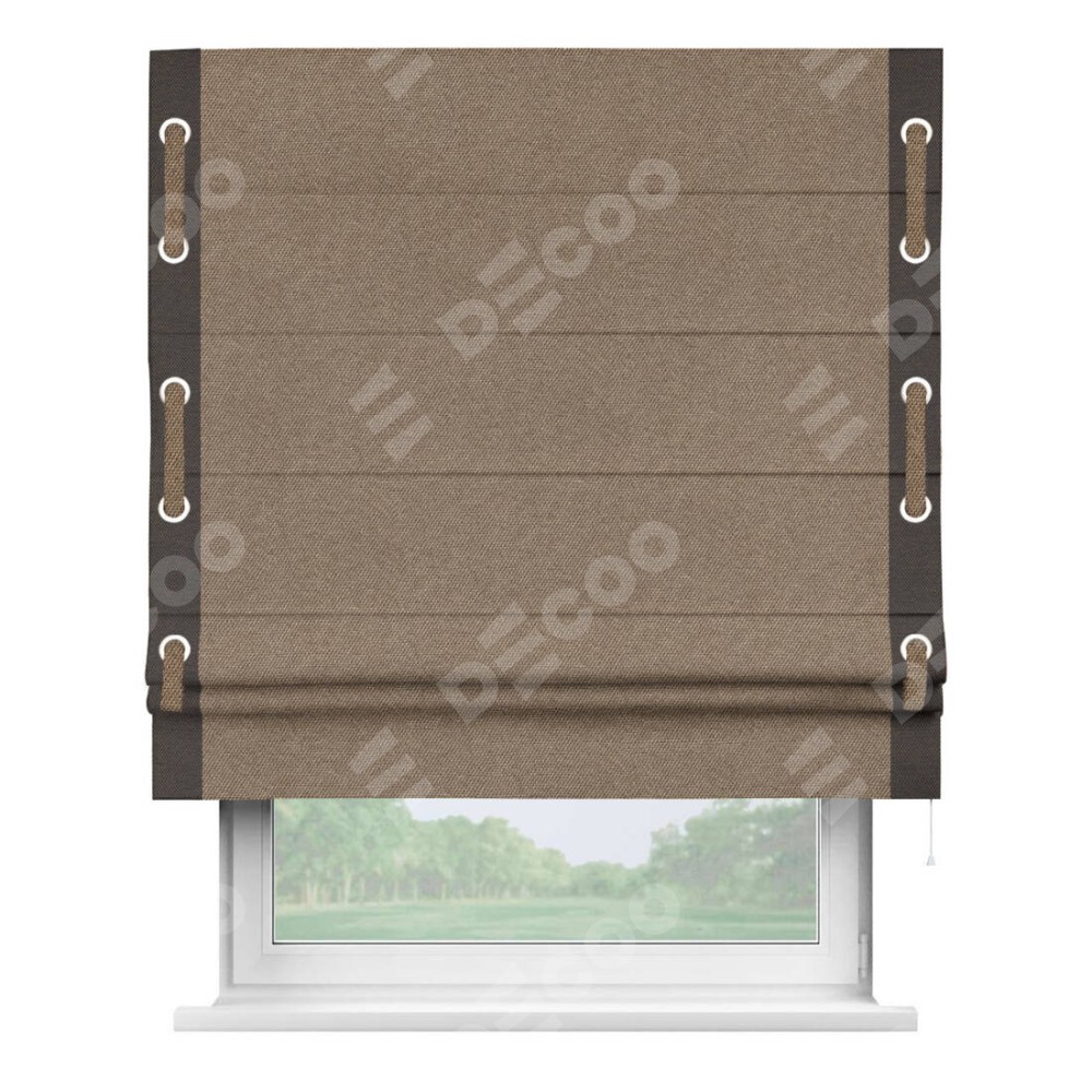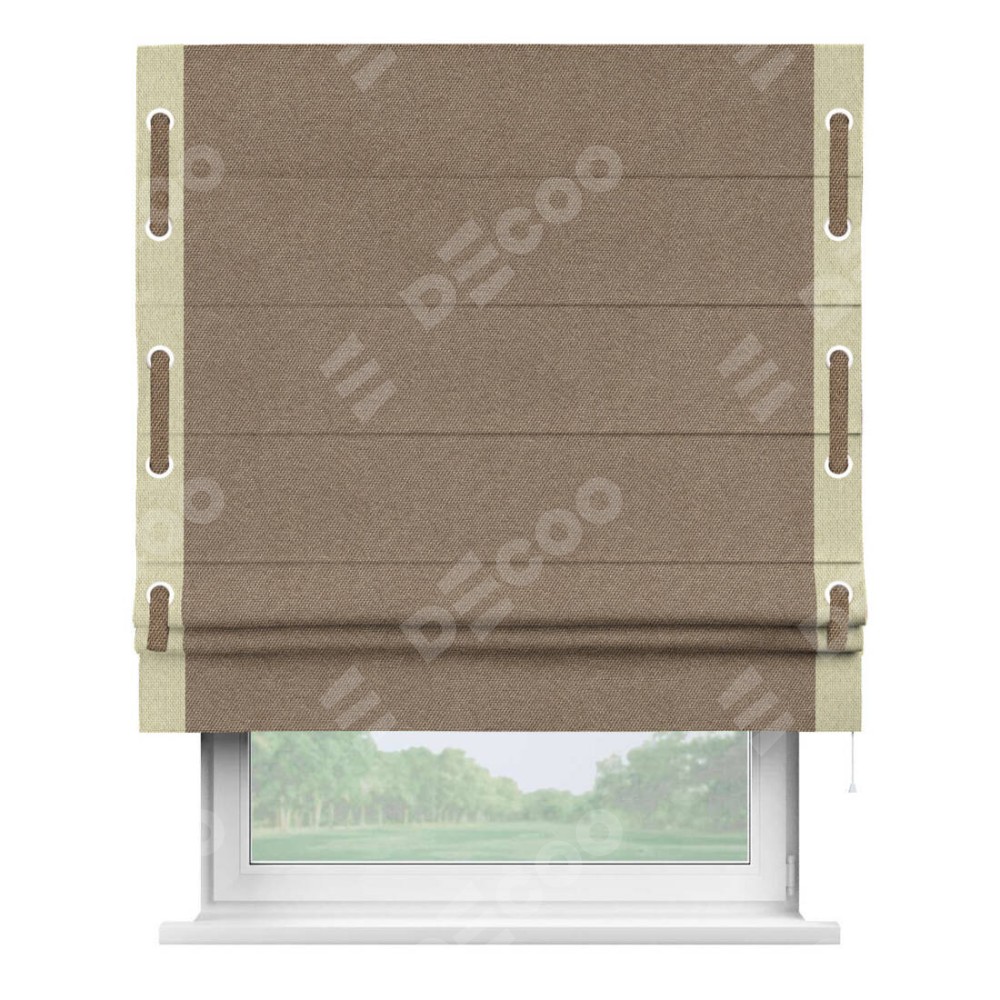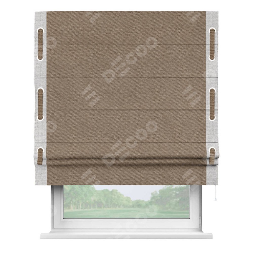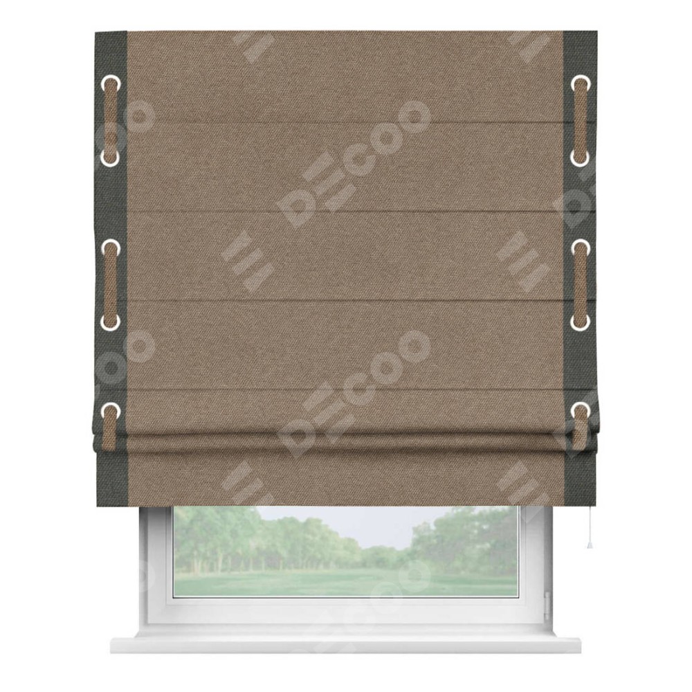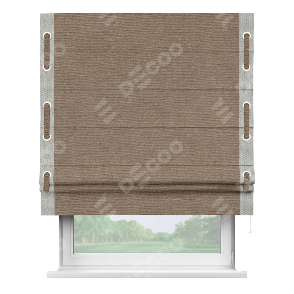 Римская штора производителя «Cortin», используется для проёма, пошита из ткани лён димаут коричневый, артикул 90996. Отделка шторы кантом «Стрим Дуо» на кантах расположены люверсы с пояском, ткань для канта используется лён димаут разной расцветки на выбор. Ткань для пояска обычно используется из основной ткани шторы, а так же можно сделать из любой расцветки по желанию. Имеет универсальный механизм и подходит для монтажа: на потолок, на стену и в нишу.